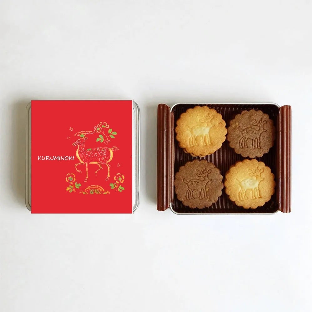 奈良の人気カフェ「くるみの木」とのコラボで、ビスケット缶を作りました。「紅牙撥鏤尺(こうげばちるのしゃく)」にあしらわれた花鹿をデザインした本展オリジナルパッケージ商品です。