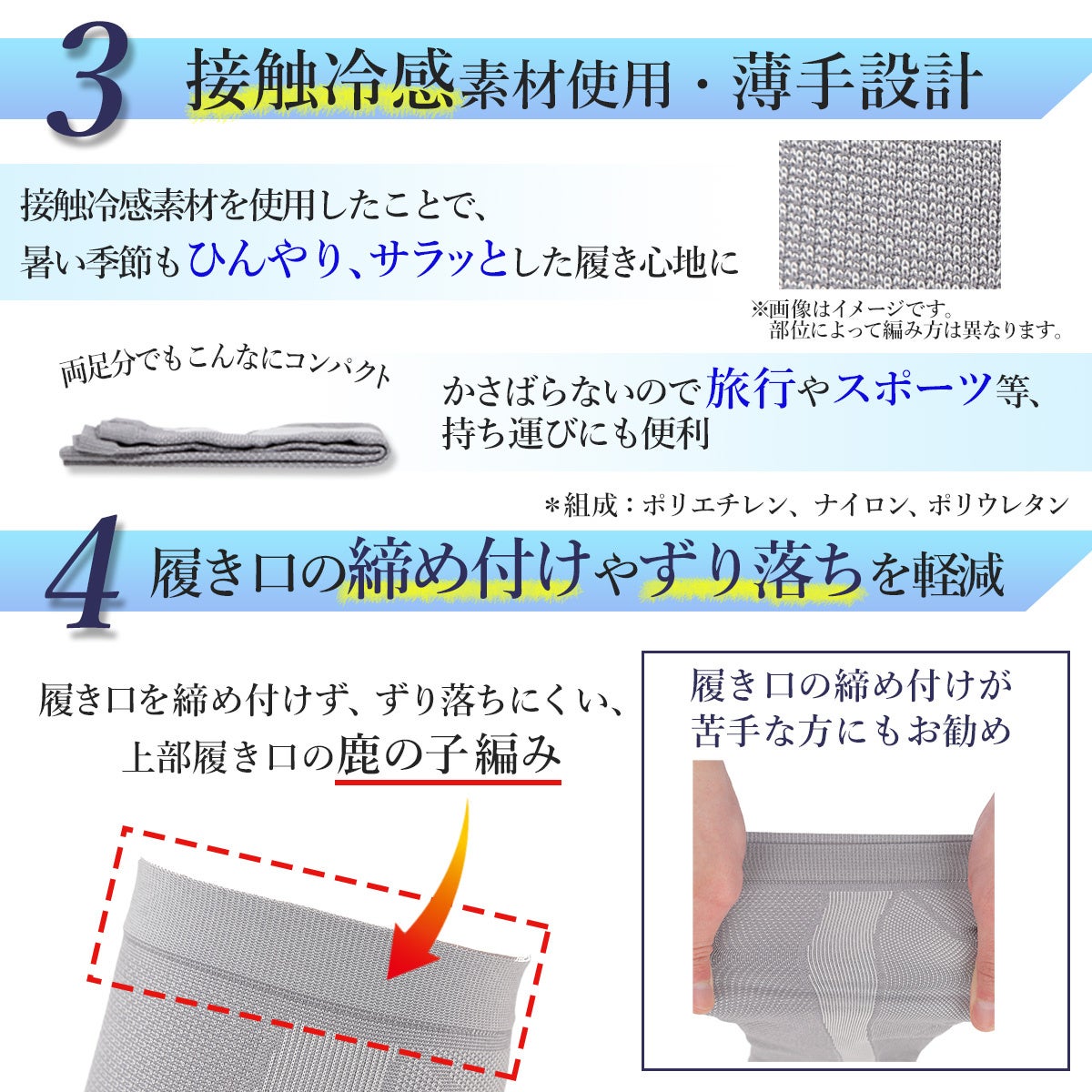 ・特長:①医師監修×国内生産、②段階着圧+ふくらはぎサポート編み、③鹿の子編み履き口、④接触冷感機能素材(Qmax0.1以上※7)※素材の熱伝導率を活かした涼感設計