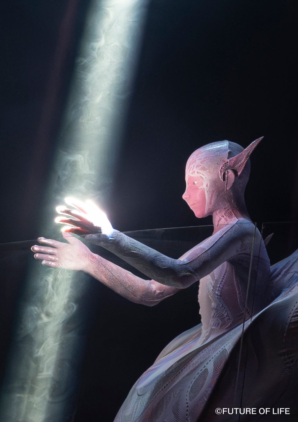 テクノロジーが進化し、人間とロボットが共存する50年後、そして人間が身体の制約から解放される1000年後の未来を、リアルなロボットと映像が混ざり合う物語として体験します。