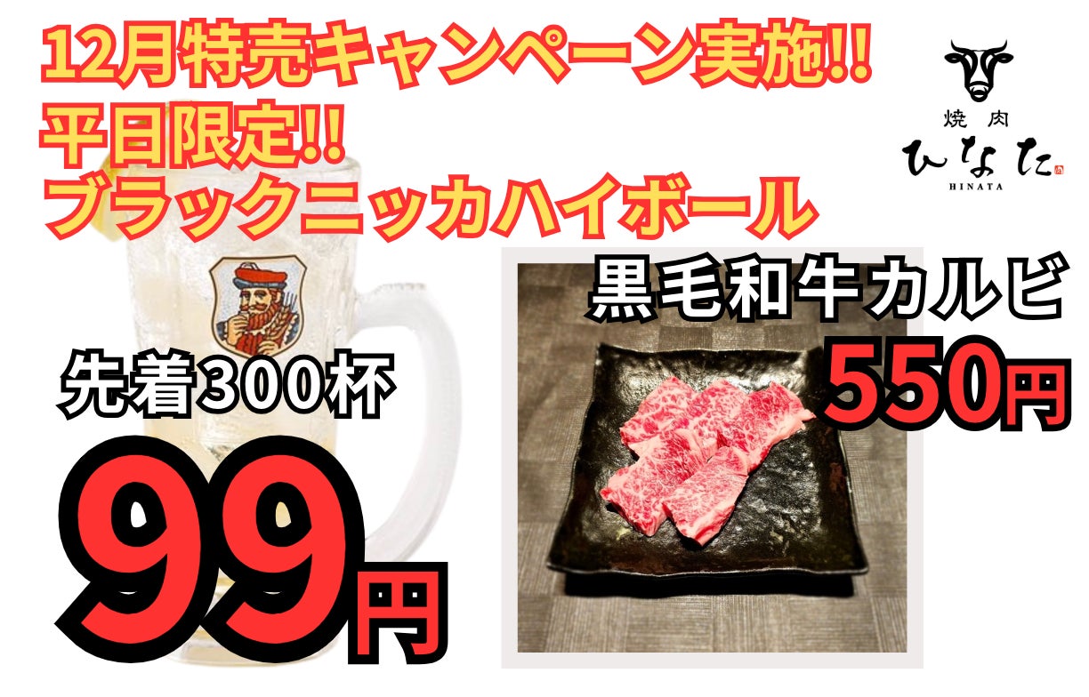 【焼肉ひなた 越谷】12月特売キャンペーン実施!!「黒毛和牛カルビ550円」&「ブラックニッカハイボール限定300杯99円」