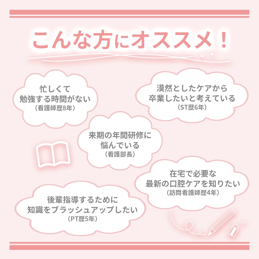 - 医療従事者: 口腔機能向上のためのスキルを学べる