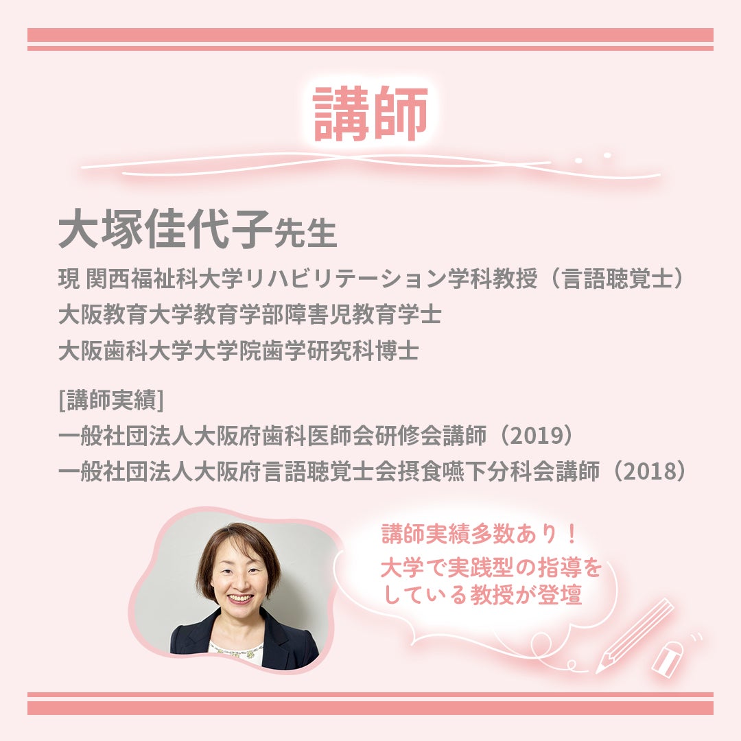 2025年1月21日、2月18日、3月18日に第一弾セミナーとして、講師に言語聴覚士・大塚佳代子先生をお迎えし「成人の口腔機能訓練」「小児の口腔機能訓練」「口腔機能訓練活用編」を開催します。