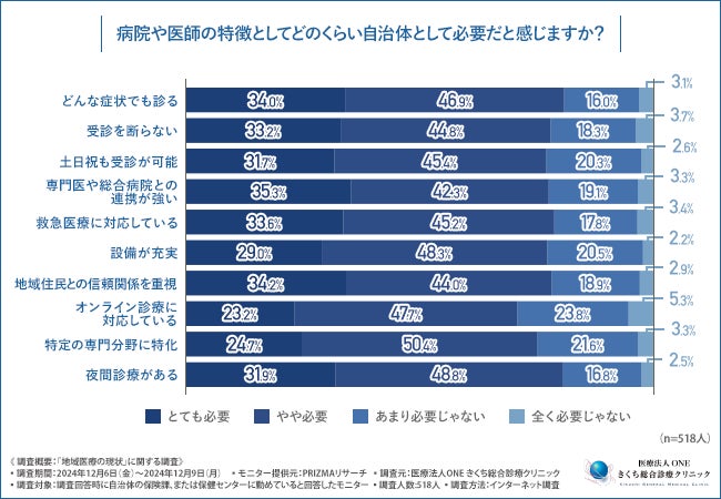 さらに、地域住民の医療ニーズは多様化しており、高齢者や子育て世代、妊婦など、さまざまな背景を持つ住民に対応する必要性が高まっています。この多様化は、医療機関の特化型対応では不十分であり、特定の専門分野に特化という点は地域医療としての必要性の中では低く推移していたことからも、幅広い診療能力を持つ医療機関や柔軟な体制が最優先で不可欠であることを示しています。