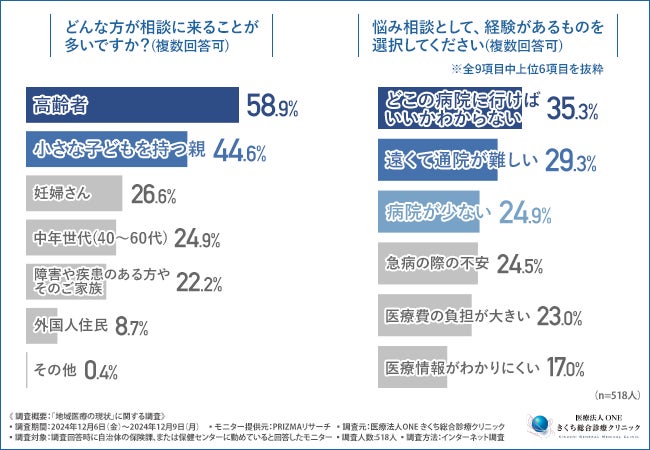 相談者としては、高齢者が最も多くなり、地域における高齢化が示唆されています。また、住民から最も多く寄せられた相談内容は「どこの病院に行けばいいかわからない」(35.3%)であり、地域医療の課題は単に医療機関を増加させるだけでは解決しないことが浮き彫りになりました。