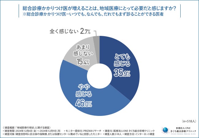「総合診療かかりつけ医が増えることは、地域医療にとって必要だと感じますか?※総合診療かかりつけ医=いつでも、なんでも、だれでもまず診ることができる医者」と質問したところ、約8割の方が『とても感じる(35.9%)』『やや感じる(46.0%)』と回答しました。
