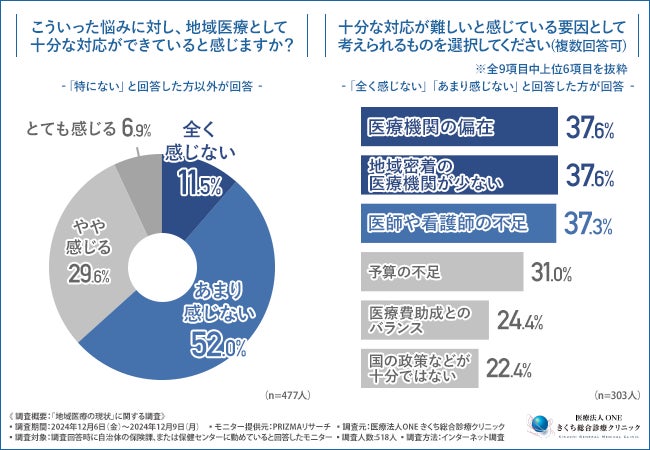 「十分な対応が難しいと感じている要因として考えられるものを選択してください(複数回答可)」と質問したところ、『医療機関の偏在(37.6%)』と回答した方が最も多く、次いで『地域密着の医療機関が少ない(37.6%)』『医師や看護師の不足(37.3%)』となりました。
