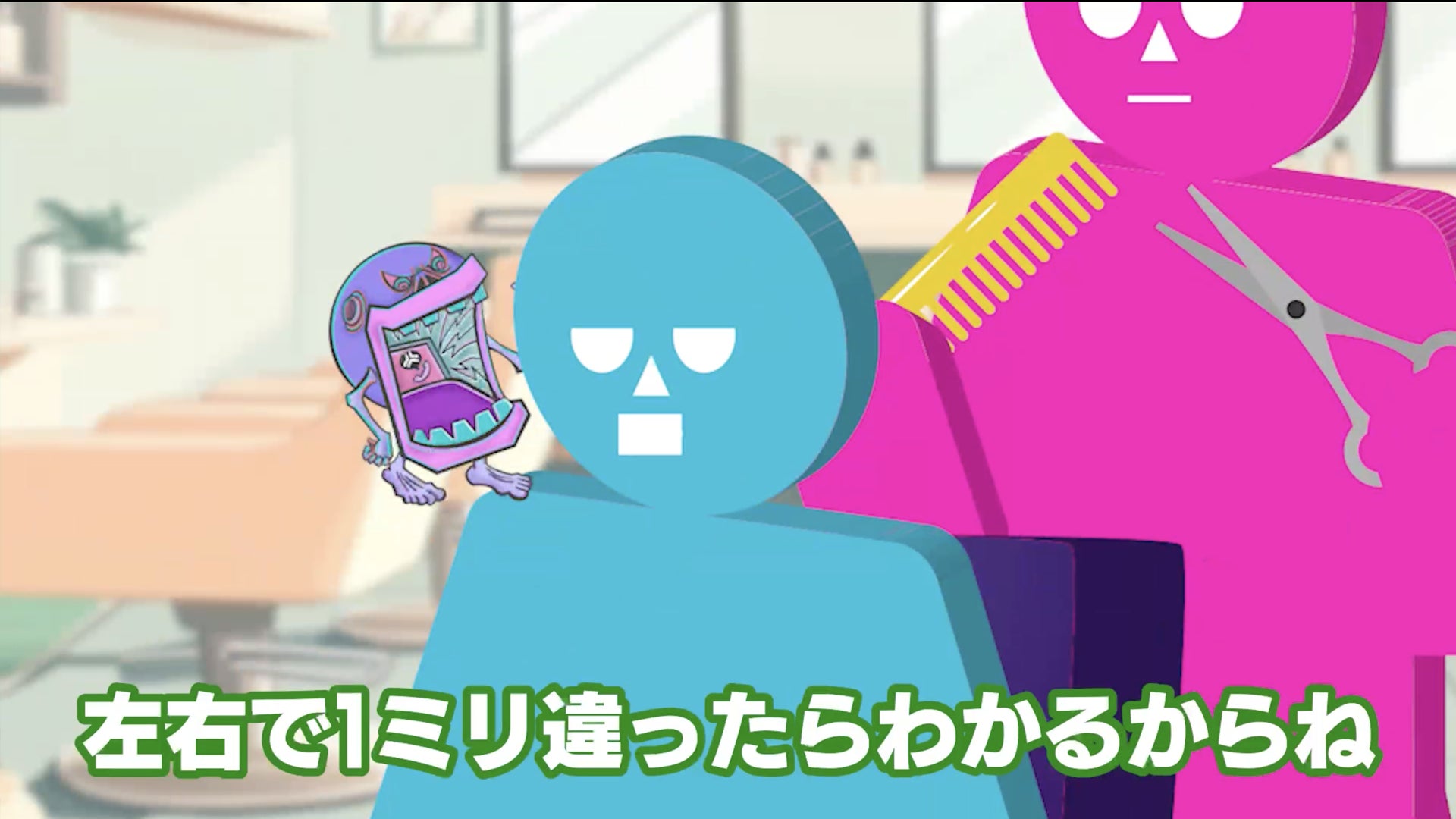 そんなカスタマーハラスメントの実態をアニメで表現。本編では、前髪が左右で1mmずれているだけで美容師を精神的に攻撃する客が登場。精神的に参りながらも施術を終えた美容師。ボロボロの気持ちで居酒屋に赴くとカスハラをしてきた客がなんと店員として勤務!立場が逆転し、美容師が客だった居酒屋店員にカスハラを仕返すといったストーリーとなっております。