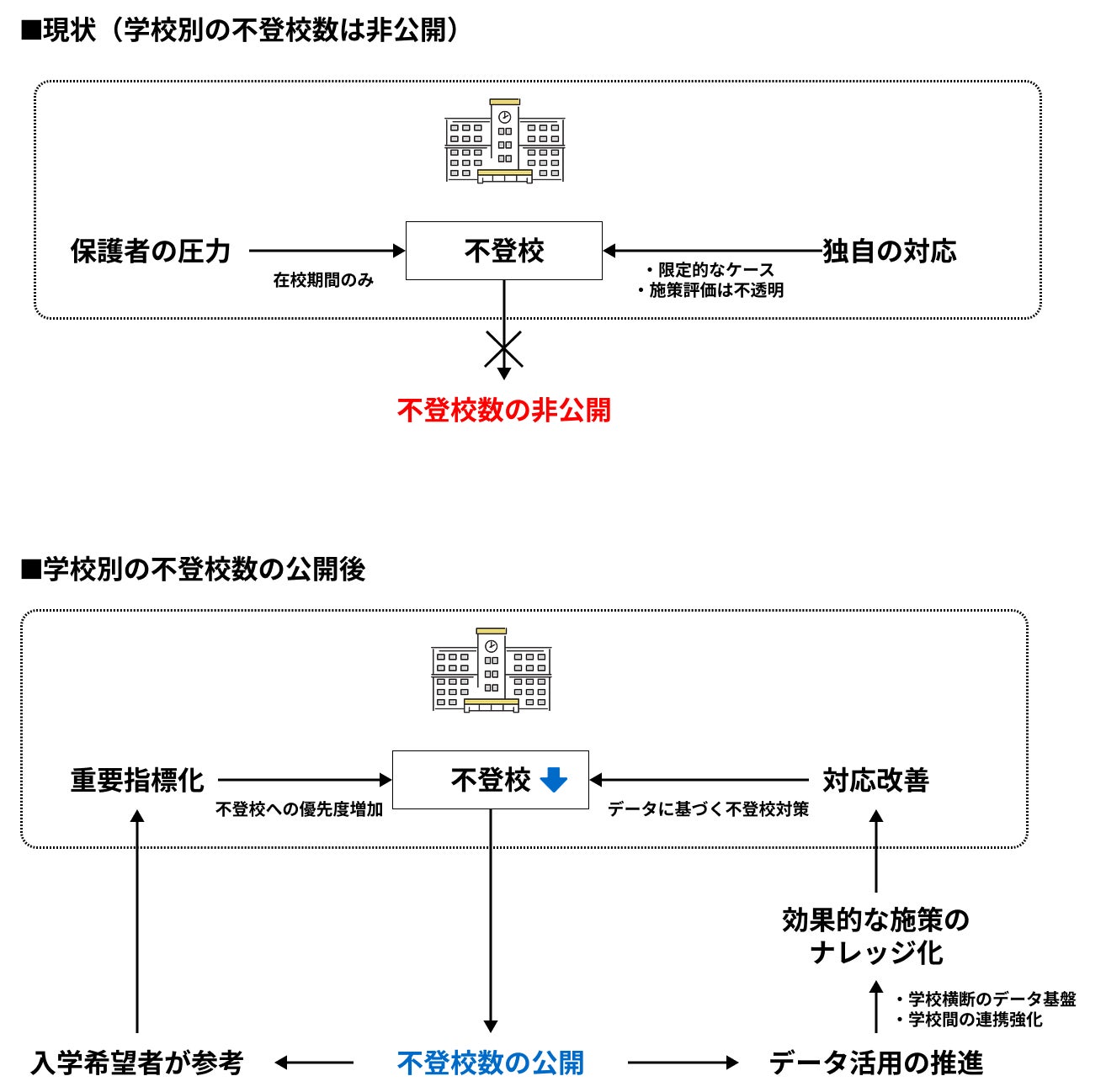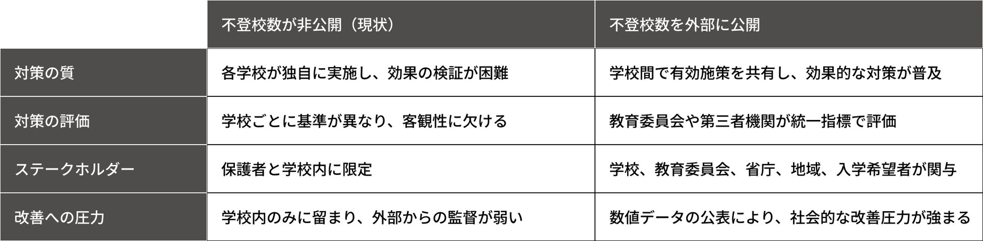 1. 学校ごとの不登校数を公開することで、情報の透明性を向上