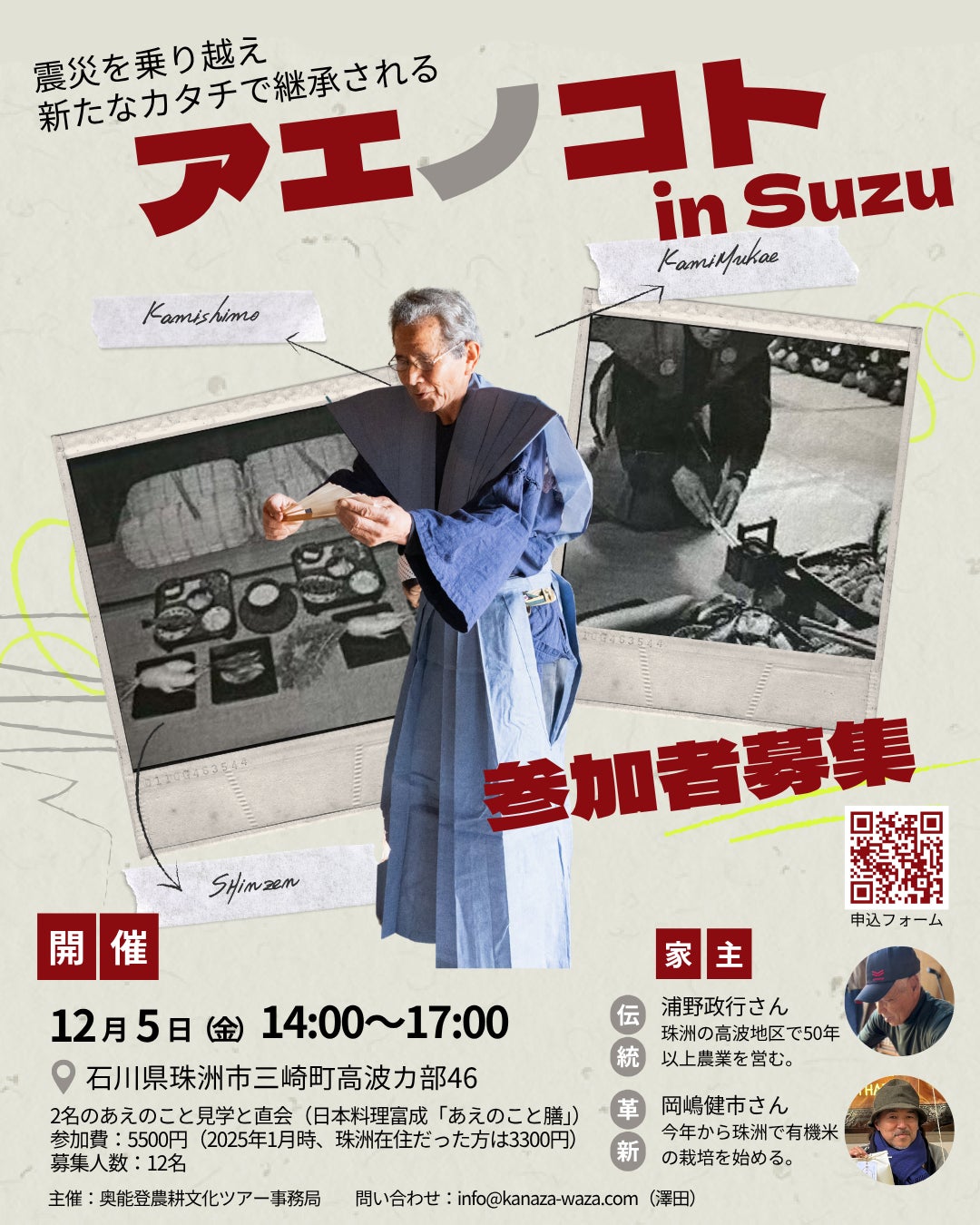 2025年12月4、5日の2日間で奥能登農耕文化ツアー事務局(企画運営:合同会社かなざわざ/本社:石川県金沢市、代表取締役:澤田雅美)は、珠洲市で2軒のお宅とともに、ユネスコ無形文化財でもある農耕儀礼「あえのこと」を執り行います。