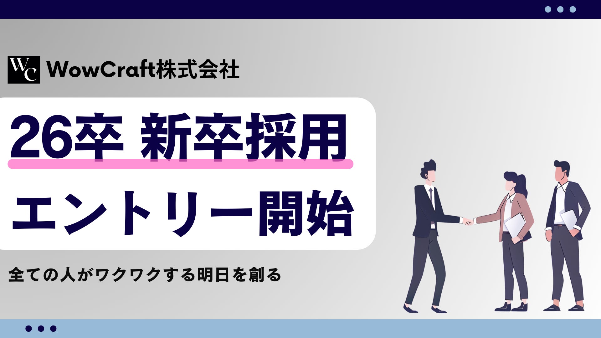 WowCraft株式会社(本社:東京都、代表取締役CEO:末角雄大、以下:WowCraft)は、2026年度入社 新卒採用本選考のエントリーを開始したことをお知らせいたします。