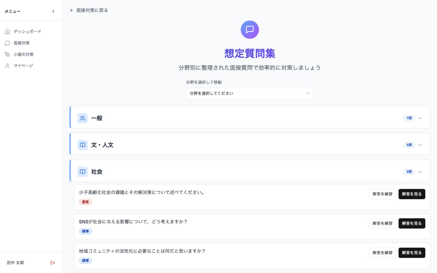 総合型選抜で頻出の質問に加え、志望学部ごとの傾向に合わせた面接練習が可能です。いつでもAIを相手に対話形式で練習でき、回答内容だけでなく、話す速度や会話全体の一貫性などもAIが分析。客観的な評価レポートを通じて、自身の強みや改善点を具体的に把握し、本番に向けた効果的な準備ができます。