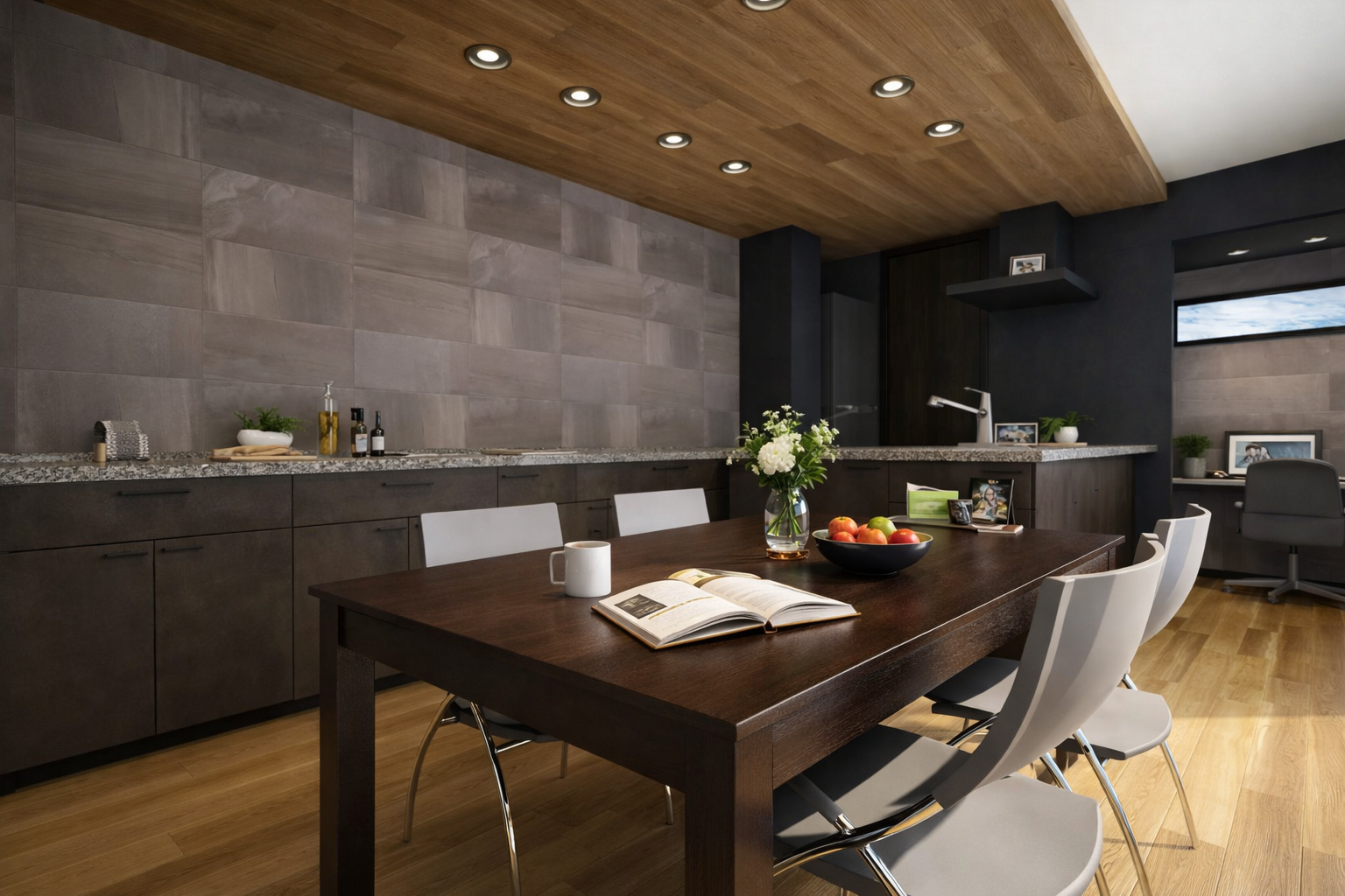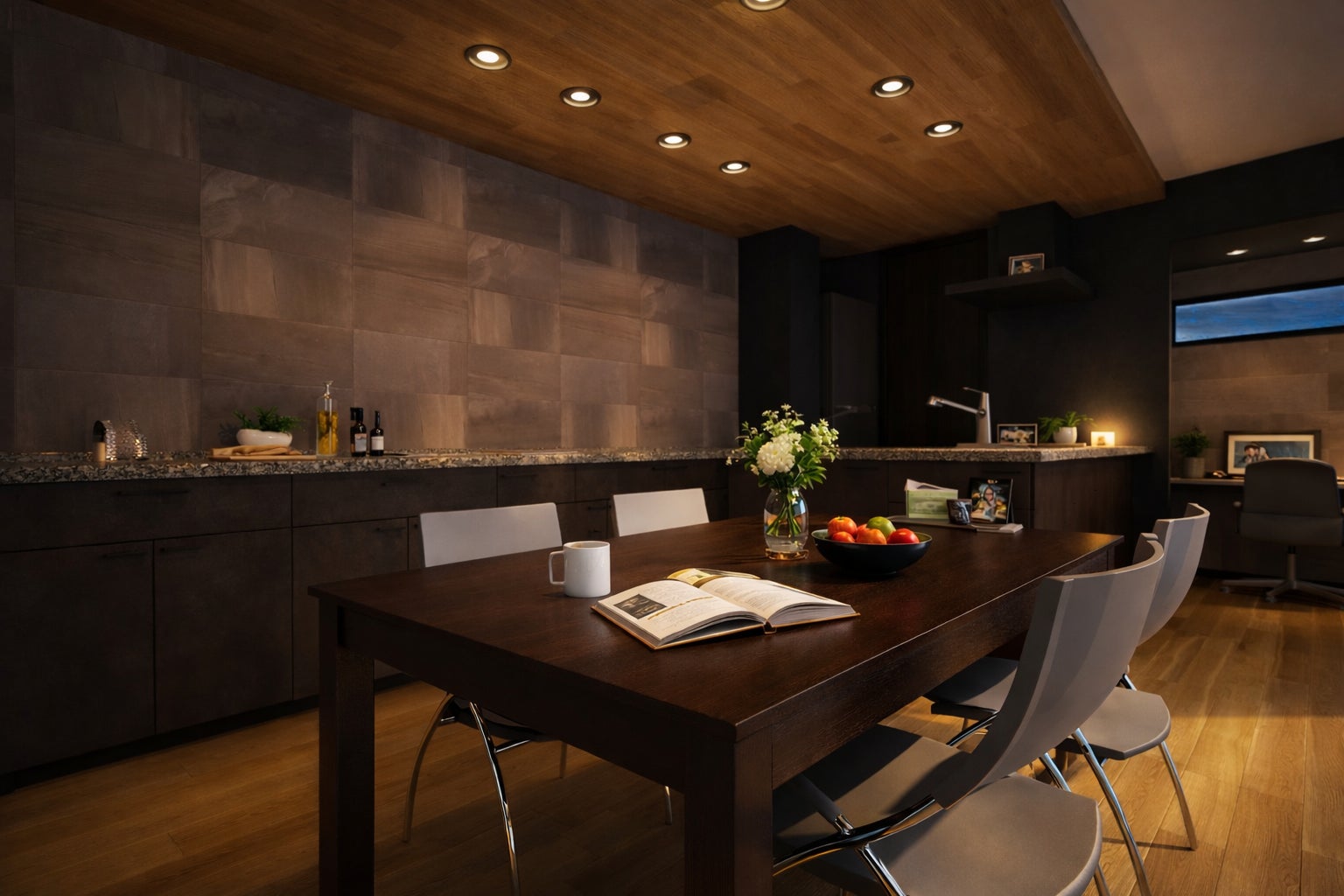 ダイニングキッチンは「下がり天井」と「間接照明」を組み合わせ、シックな色使いでコーディネート。夜にはまるで行きつけのバーにいるような、落ち着いた寛ぎの時間を愉しめます。
