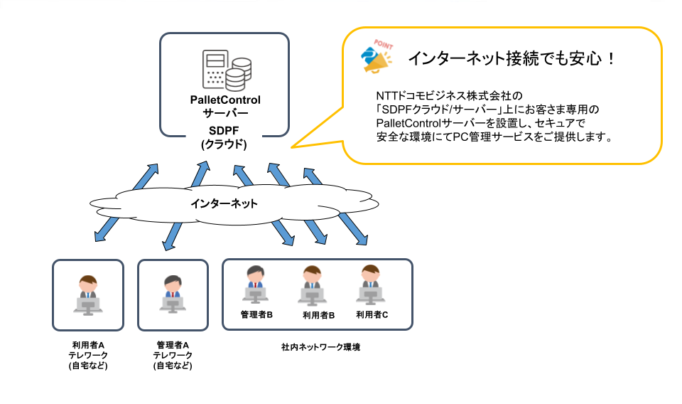 PCの調達・導入・運用から廃棄までPCのライフサイクルを全面的にサポートする、JALデジタルのクラウド型IT資産管理ツールです。インターネット接続だけで利用できるので、サーバーのバージョンアップなどのメンテナンスが不要になり、運用業務の負担を軽減することが可能です。JALグループのPC運用管理を長年支えてきた「PalletControl」と同様に、初めての方でも直感的に「分かりやすい」管理画面と柔軟な「配布」機能により、日々の PC運用管理業務における効率化を実現します。