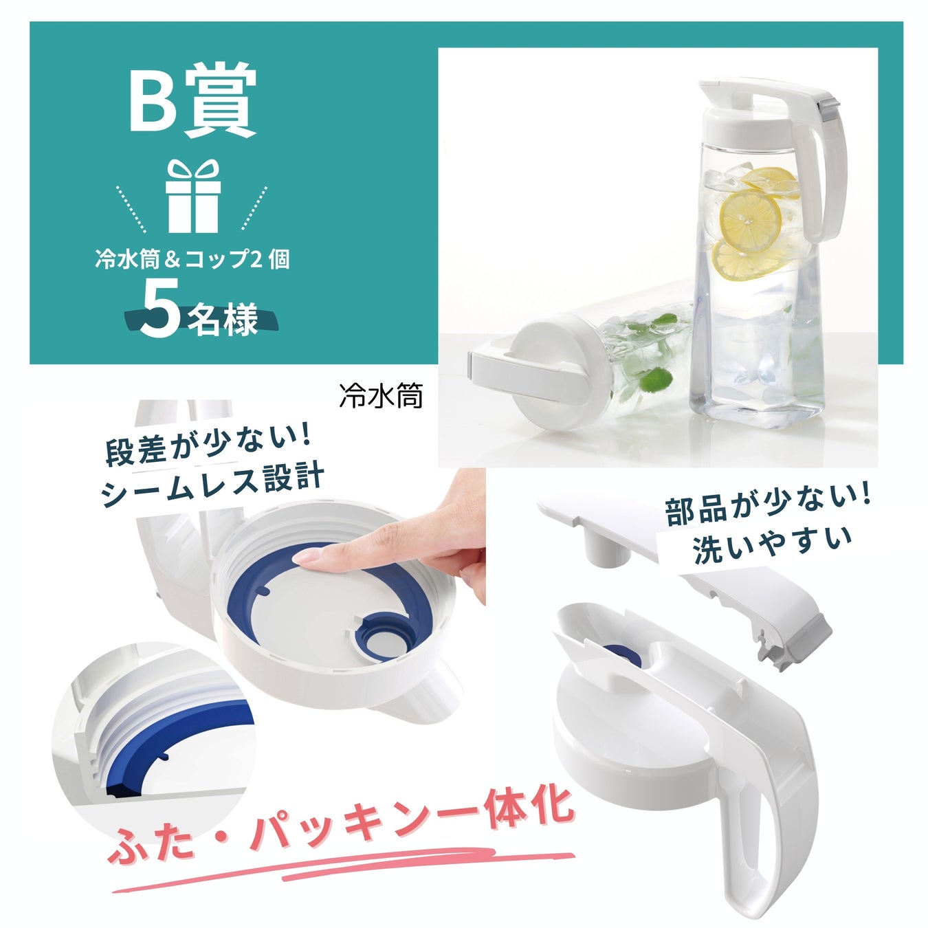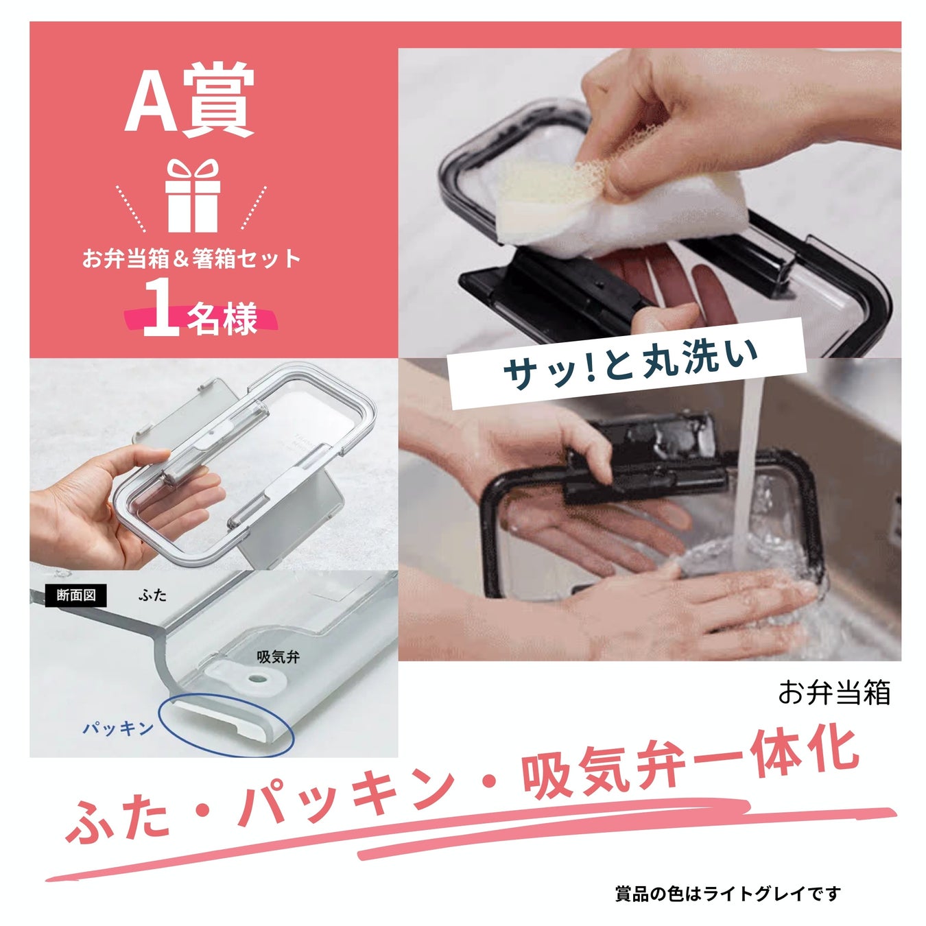 「ふた、パッキン、吸気弁が一体化したお弁当箱600mL」と「箸箱セット」1名様 「ふたとパッキンが一体化!シームレスピッチャー2.1L」と「とっても強いコップ2個」5名様 |
