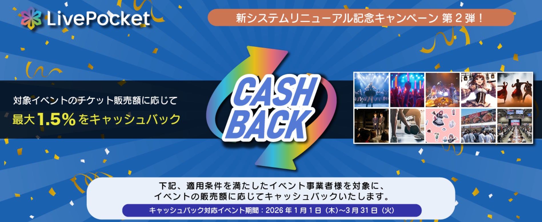 LivePocket株式会社(本社:東京都港区、代表取締役:権正和博)は、当社が提供する電子チケット販売プラットフォーム「LivePocket」の新システムのリリースを記念し、2025年10月20日(月)より開催中の新システムリリースキャンペーン第一弾(詳細リンク)と並行し、イベント事業者様に向けて第二弾となるキャッシュバックキャンペーンを開催いたします。