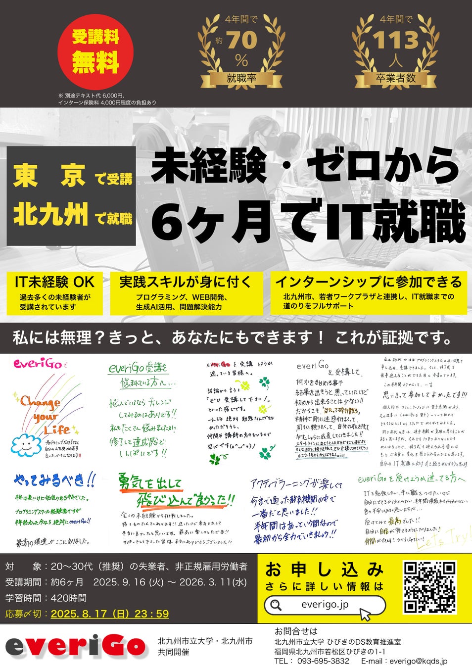 北九州市立大学と北九州市が共催する本格的な職業訓練プログラム「everiGo(エブリゴー)」が、2025年9月より第5期を開講。今回は初めて、【関東(東京)在住の方向けの特別枠】を設け、遠隔受講が可能となりました。