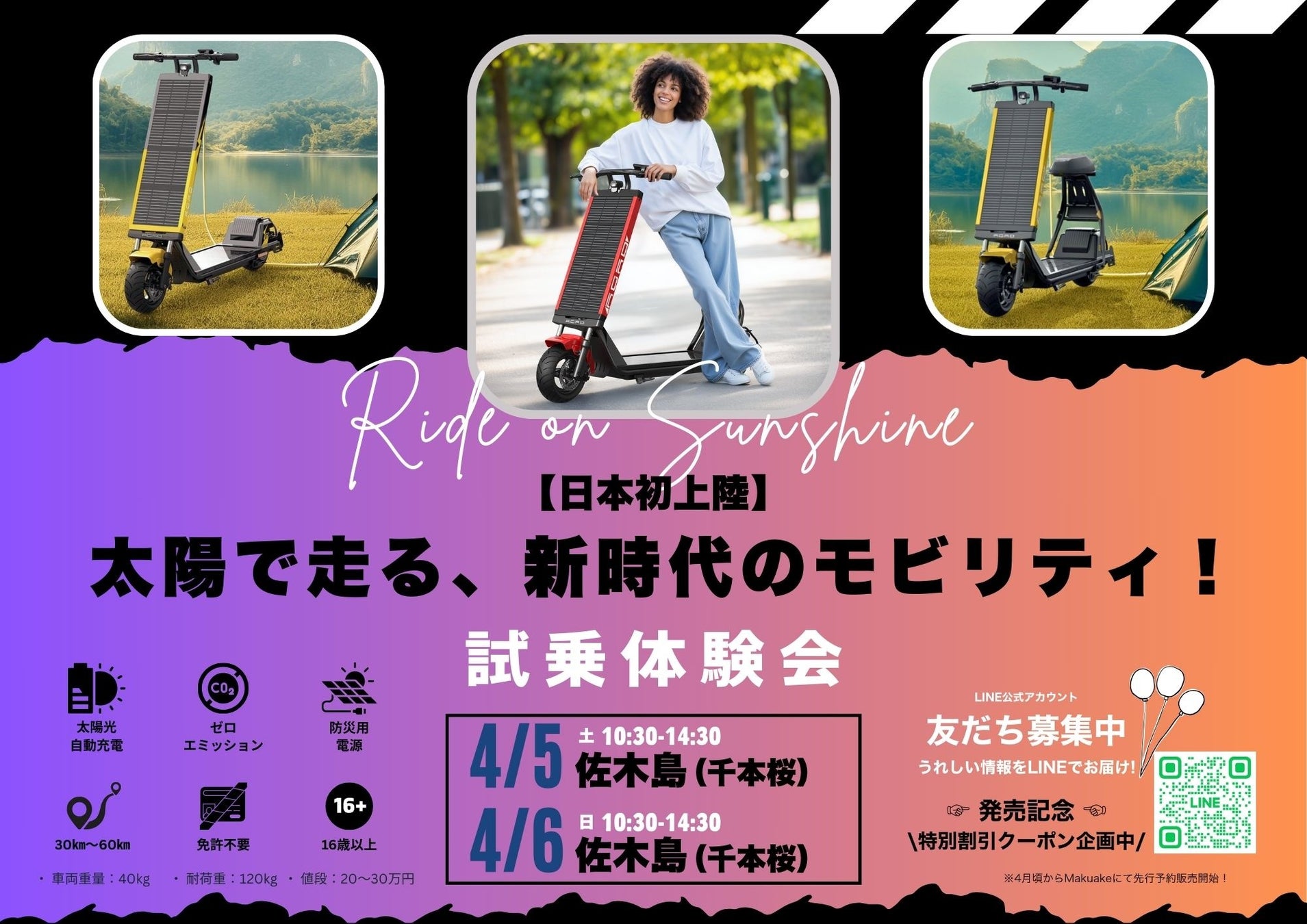 先日大好評をいただいた佐木島での試乗体験イベントを、**4月5日(水)および4月6日(木)**に再度開催いたします。ちょうど桜が満開を迎えるこの時期に、桜吹雪の中でHelioXのソーラーマイクロモビリティを体験してみませんか?