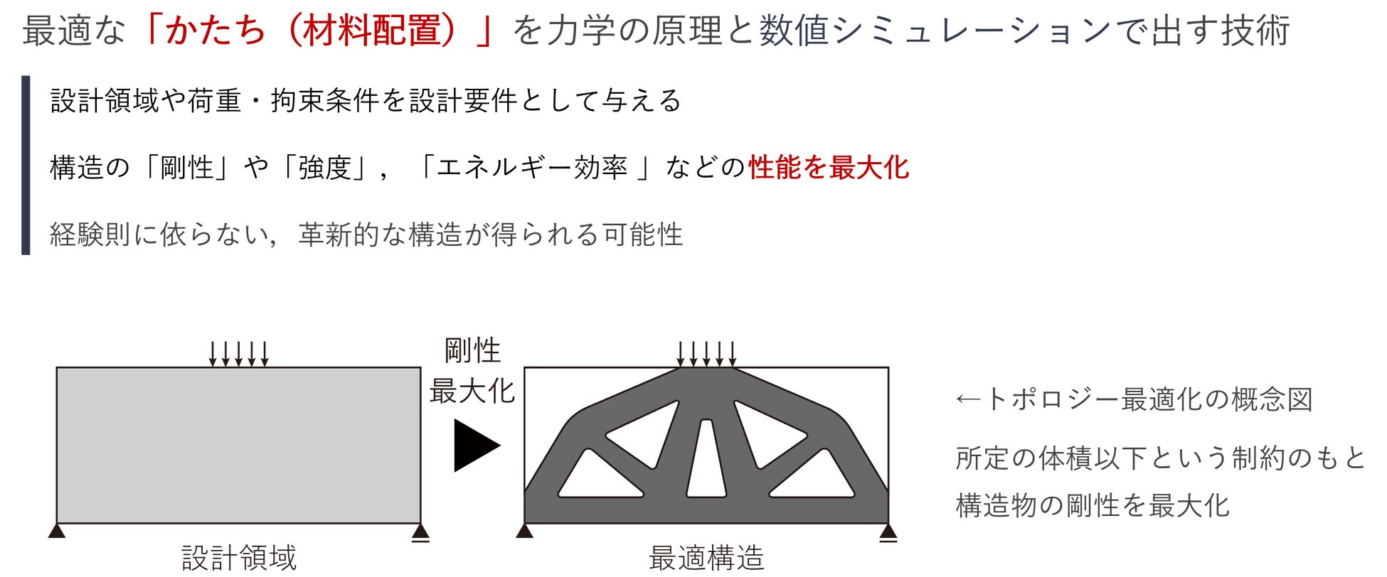 最適な「かたち(材料配置)」を力学の原理と数値シミュレーションで出す技術です(図1)。