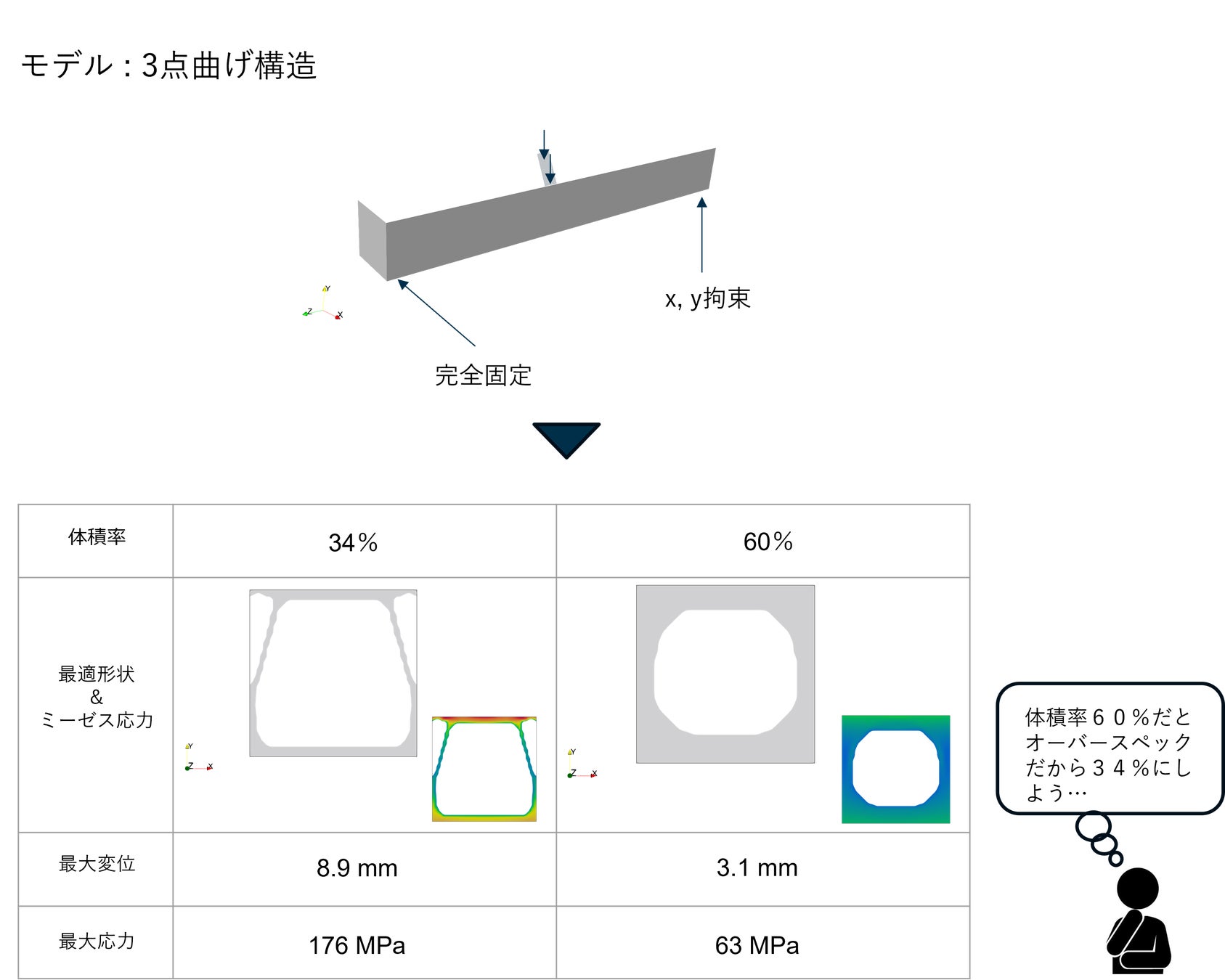材料の体積率を変更して複数回最適計算を実施することで、結果を比較し、設計案を検討することが可能となります。