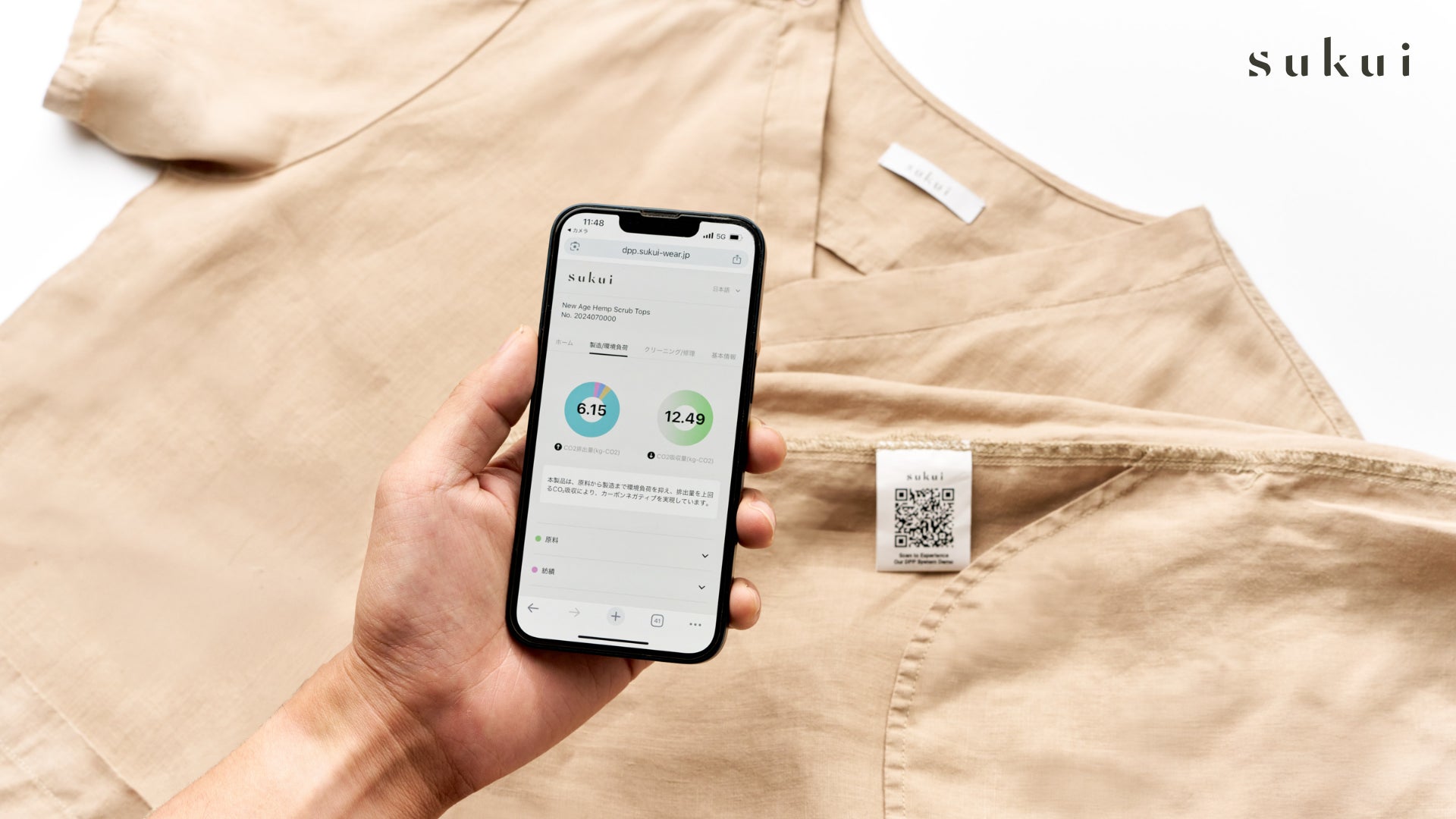 sukuiは、ヘンプを用いたカーボンネガティブ医療ウェアです。製品にはブロックチェーン型DPP(デジタルプロダクトパスポート)を搭載。CO₂排出・吸収量やトレーサビリティ情報を可視化し、医療従事者がサステナブルな選択をできる仕組みを提供します。