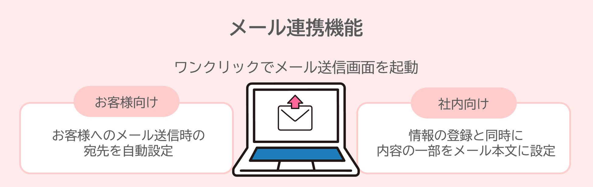 WiseOffice®2の個人および法人顧客詳細画面において、顧客のメールアドレスをクリックするだけで宛先が自動設定された状態でメール送信画面が起動します。これにより、商談へのお礼や資料送付、電話問い合わせへの回答などの対応がスムーズに行えます。