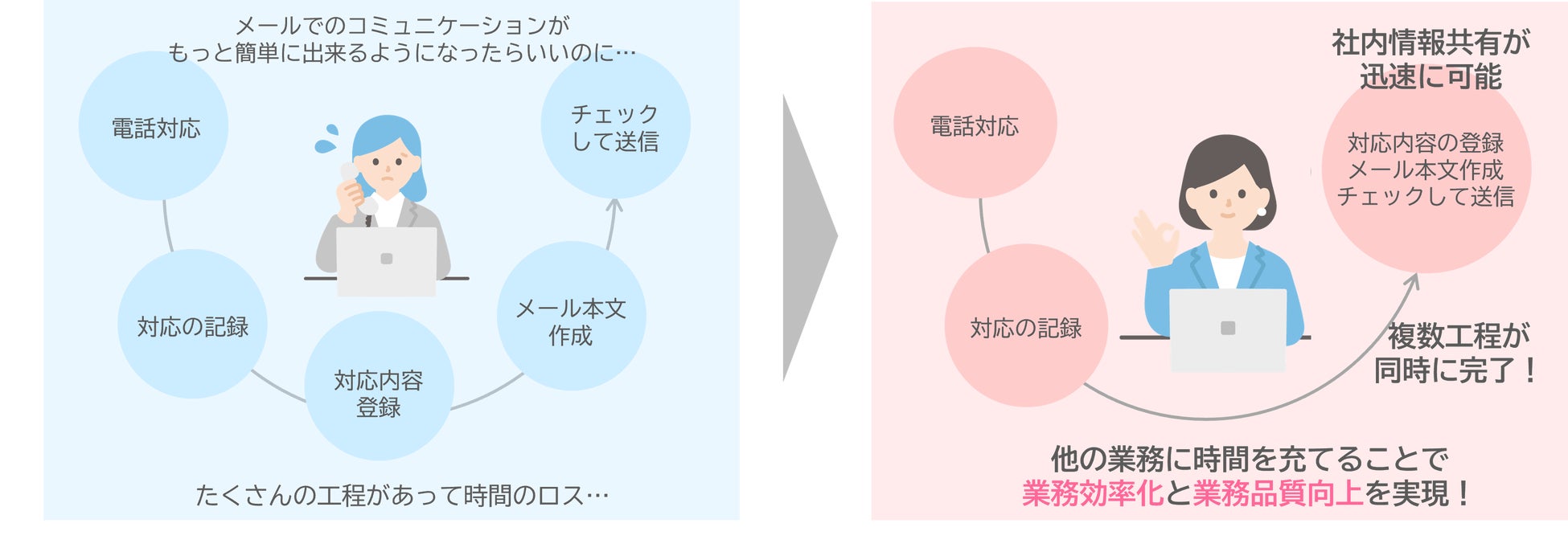 昨今、保険代理店には、金融庁が策定した「顧客本位の業務運営に関する原則」に基づく「顧客本位の業務運営の徹底」が求められており、より高い業務品質が必要とされています。業務品質は、業務を正確かつ効率的に一貫して行い、顧客の期待を満たし、継続的に点検と改善を行うことで評価されます。お客様や社内のコミュニケーションにおいても、同様の品質が求められます。正確で効率的なコミュニケーションは、業務品質の向上に寄与します。そこで、業務負担を減らしながらコミュニケーションの強化を図るための機能として追加開発されました。