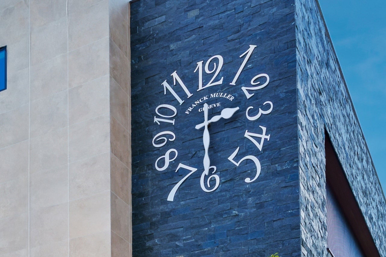 外観にはブランドを象徴するビザン数字と時計機構をモチーフにした大型屋外時計(ウォールクロック)を設置し、夜間にはライトアップ演出を採用。