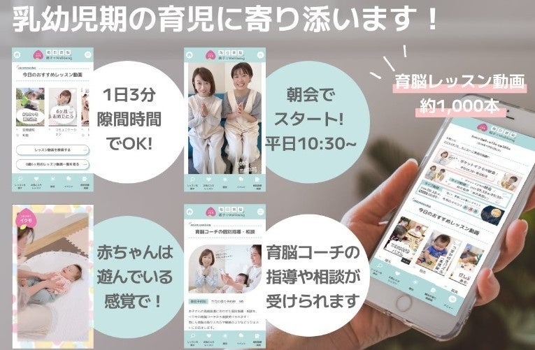 大家族で赤ちゃんへの刺激が大きかった昔に比べ、母親単独育児も多くなってきた現代において、多すぎる育児情報に右往左往してお世話に追われるうちに大切な時期はあっという間に過ぎ去ってしまう。そんな現代のママ、パパに向けて毎日の育児の中に取り込むだけで自然と育脳保育ができるようにデザインされた「イクモ育脳アプローチ」をスマホで毎日簡単に学ぶことができます。
