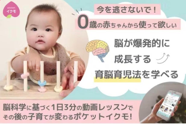 「ポケットイクモ」は、脳科学をベースにして実際に9年間育脳保育園(イクモ保育園)で実践・研究されてきたメソッドを、1日たった3分間動画を見ることで学べ、実践できるサービスです。