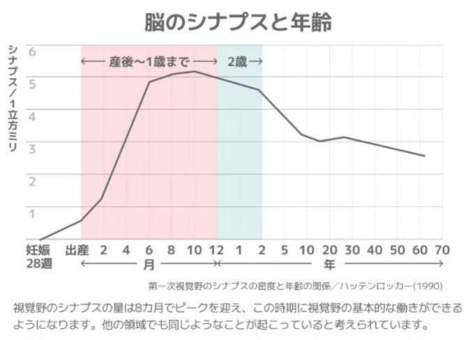 生まれた瞬間から歩き始める12カ月くらいまでの間は脳のシナプシス(神経回路)の密度が急成長していく特に重要な時期。この時期にどんな関わり方をして赤ちゃんの脳に刺激を与えるかによって、その子の持つ才能や感性、社会性、さらには親子の愛着関係にまで大きく影響を与えていきます。