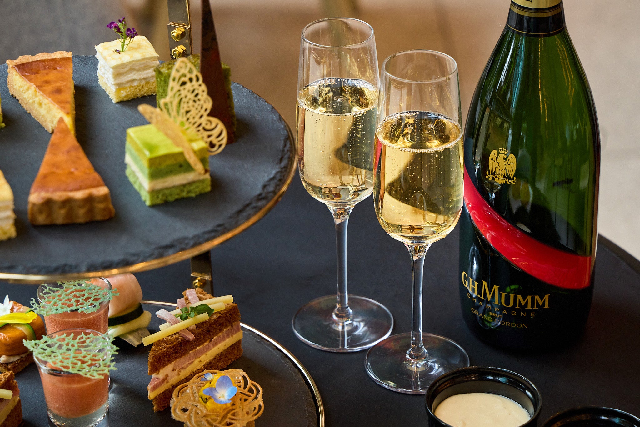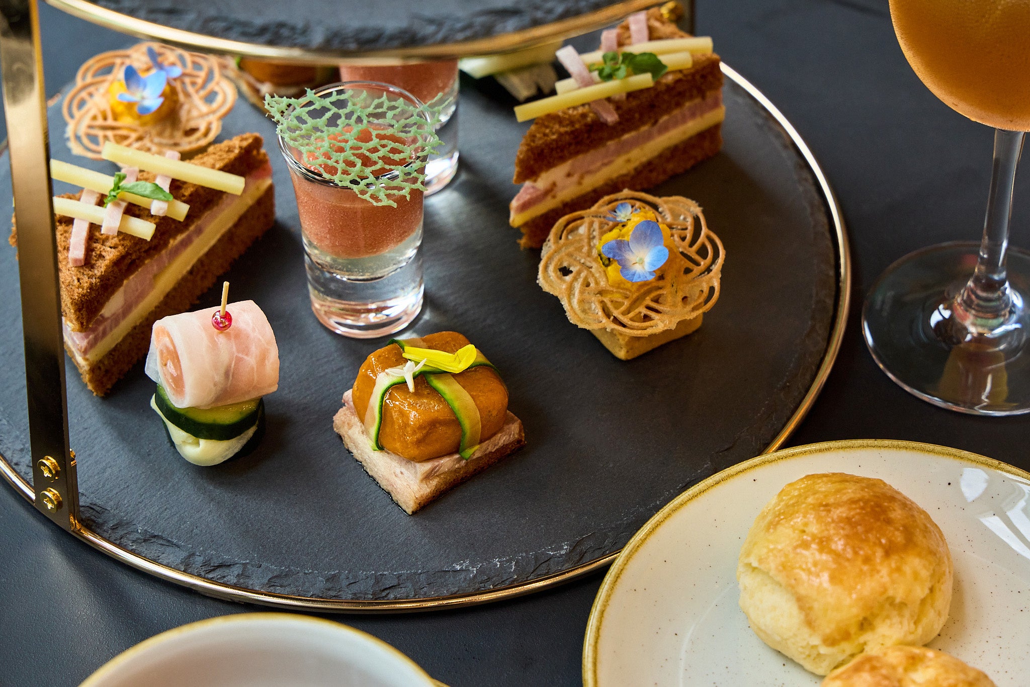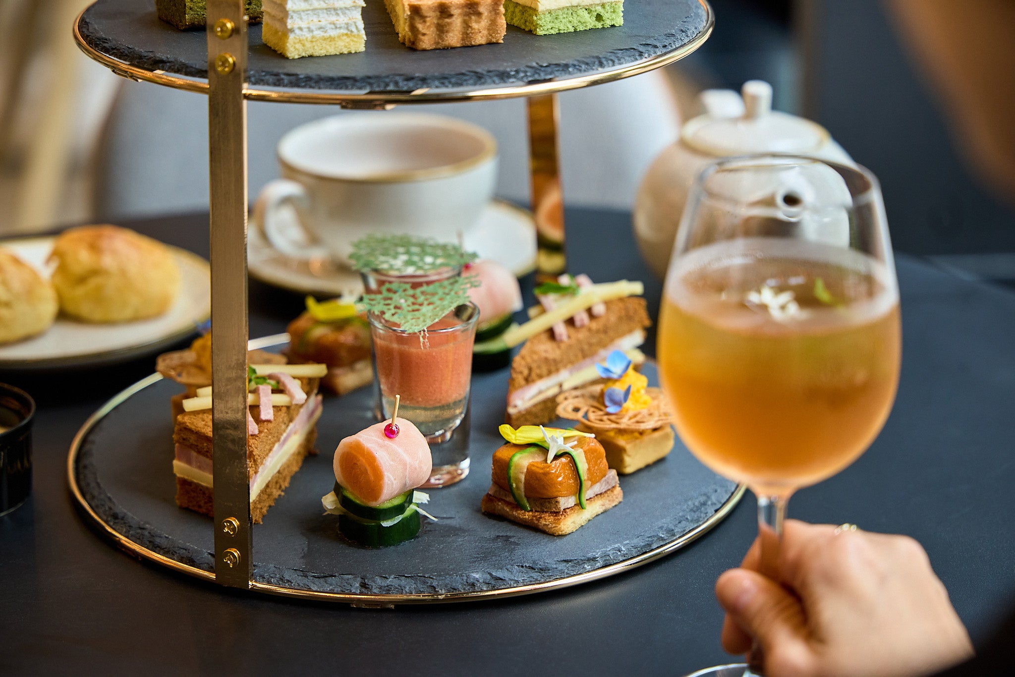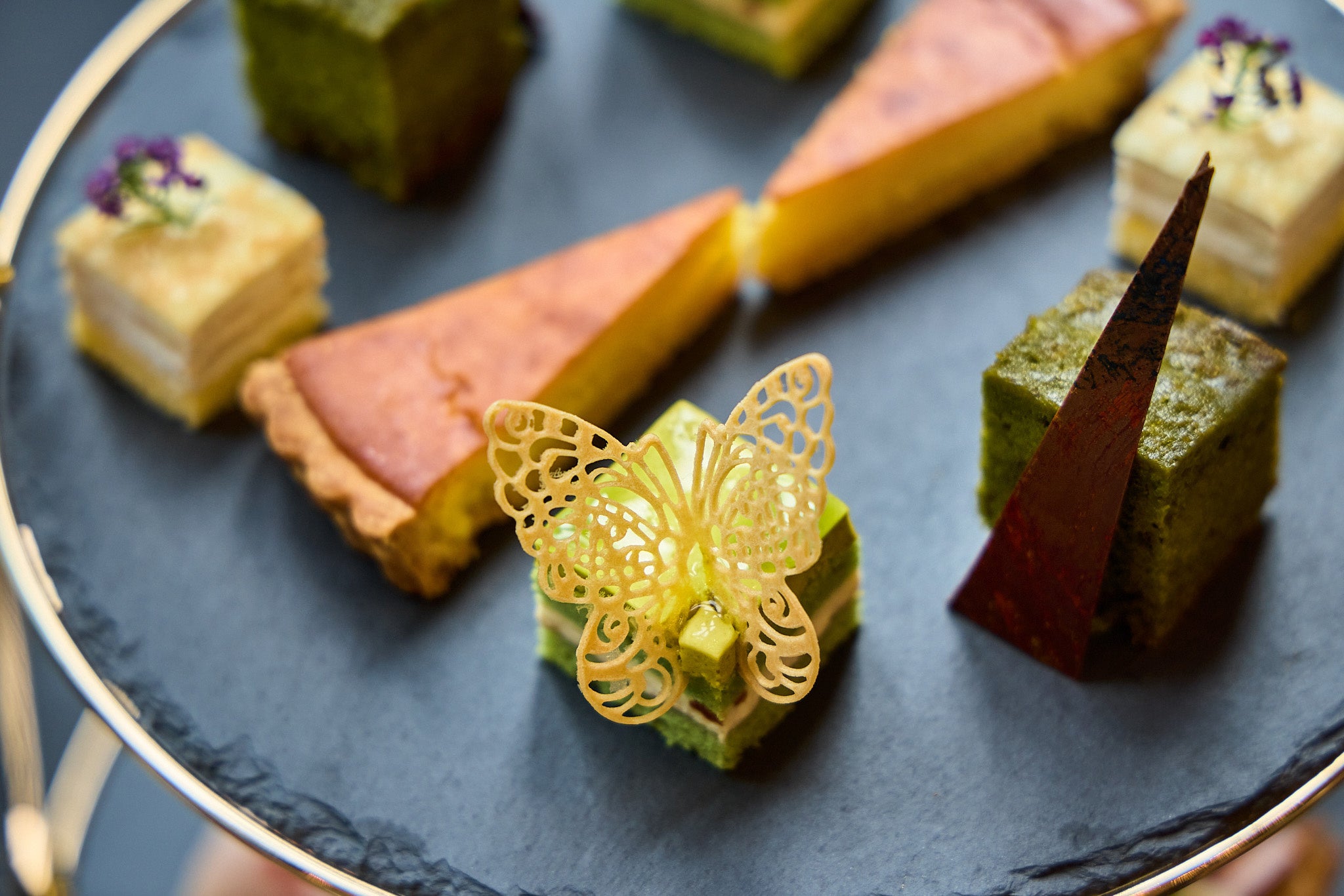 クラシックな英国式アフタヌーンティーをご用意しました。爽やかな白桃が香るウェルカムドリンクで、まずは喉を潤して。スイーツは、しっとりとした抹茶ブラウニーや、シェフ特製のチーズケーキタルトなど4種。セイボリーには、柿ジャムを添えたサンドイッチや、夏にぴったりの冷製ガスパチョスープなど5種をご用意しております。紅茶とコーヒーはお好きなだけ。銀座の隠れ家で、ゆったりとした午後のひとときをどうぞお楽しみください。