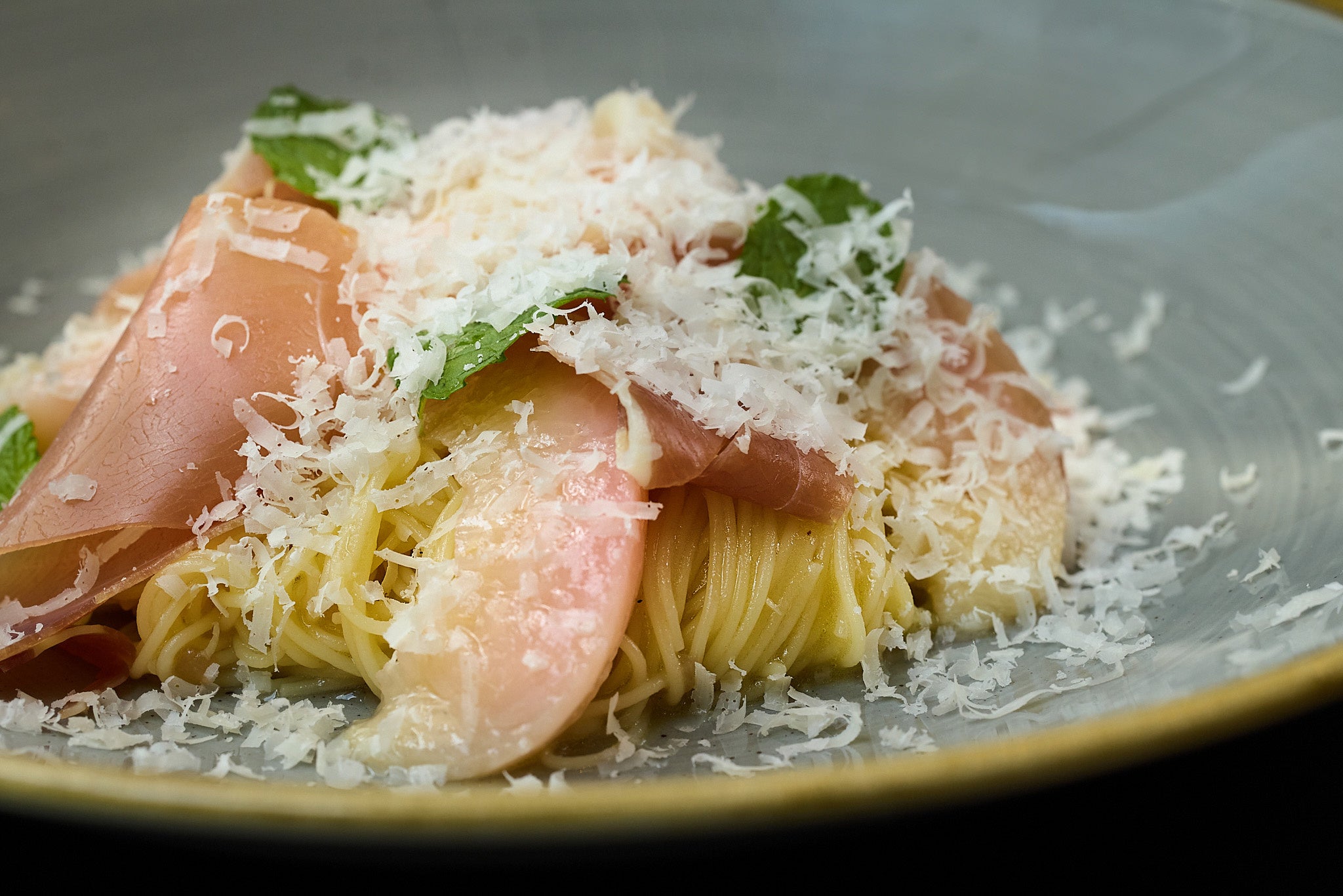 旬の国産桃と冷製のカッペリーニを合わせた、夏にぴったりの爽やかなパスタ。パルメザンチーズが桃の甘みと見事に調和し、奥行きのある味わいを演出します。さっぱりとした冷た いパスタとジューシーな桃の贅沢なマリアージュをお楽しみく ださい。