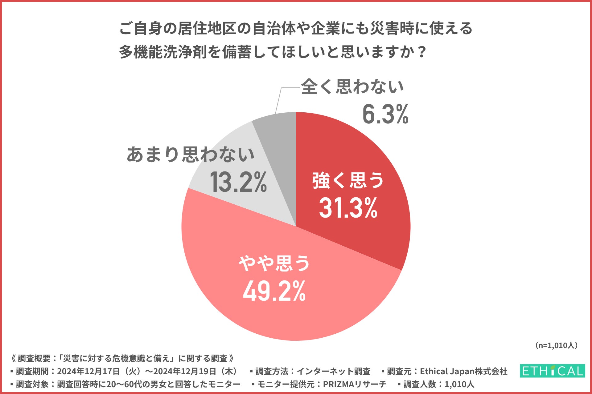「ご自身の居住地区の自治体や企業にも災害時に使える多機能洗浄剤を備蓄してほしいと思いますか?」と質問したところ、約8割の方が『強く思う(31.3%)』『やや思う(49.2%)』と回答しました。