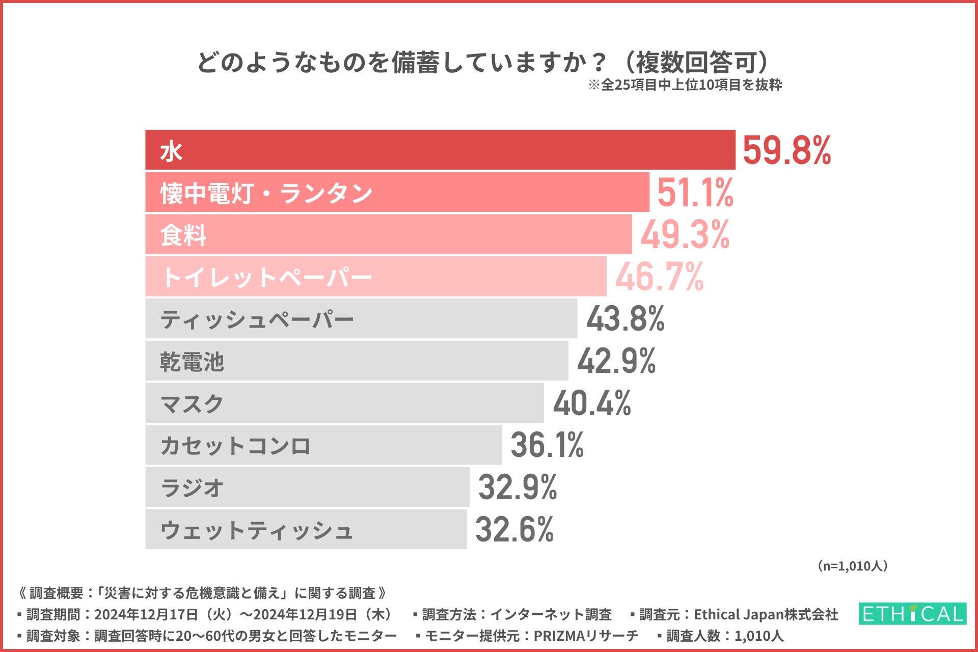 そこで、「どのようなものを備蓄していますか?(複数回答可)」と質問したところ、『水(59.8%)』と回答した方が最も多く、次いで『懐中電灯・ランタン(51.1%)』『食料(49.3%)』『トイレットペーパー(46.7%)』となりました。
