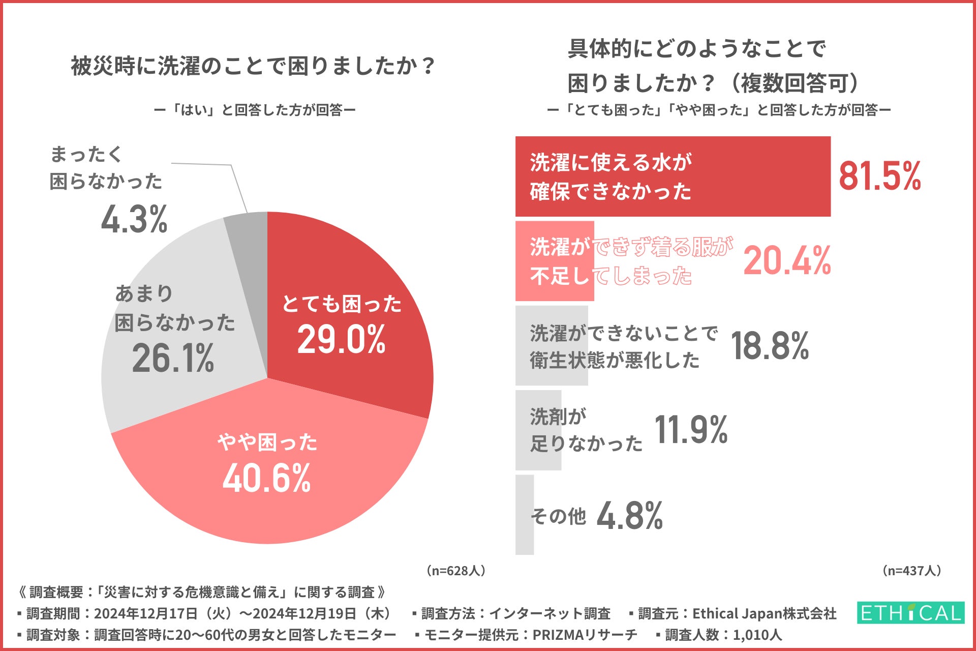 前の質問で『とても困った』『やや困った』と回答した方に、「具体的にどのようなことで困りましたか?(複数回答可)」と質問したところ、『洗濯に使える水が確保できなかった(81.5%)』と回答した方が最も多く、次いで『洗濯ができず着る服が不足してしまった(20.4%)』となりました。