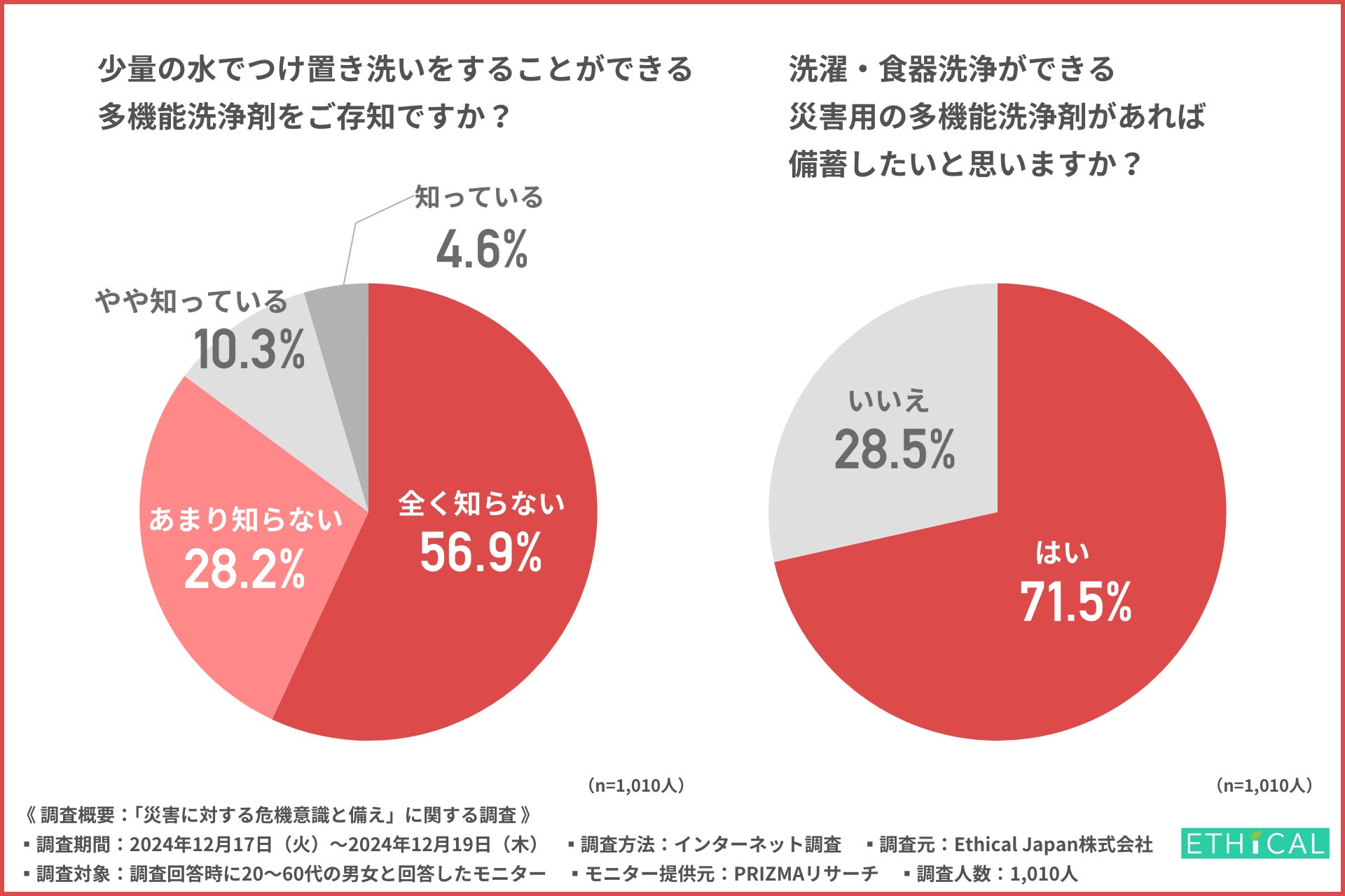 多機能洗浄剤の認知度は非常に低いようですが、衣類や食器など多機能にわたって使用できる洗浄剤があれば、被災時の洗濯への不安も少しは解消されるのではないでしょうか。