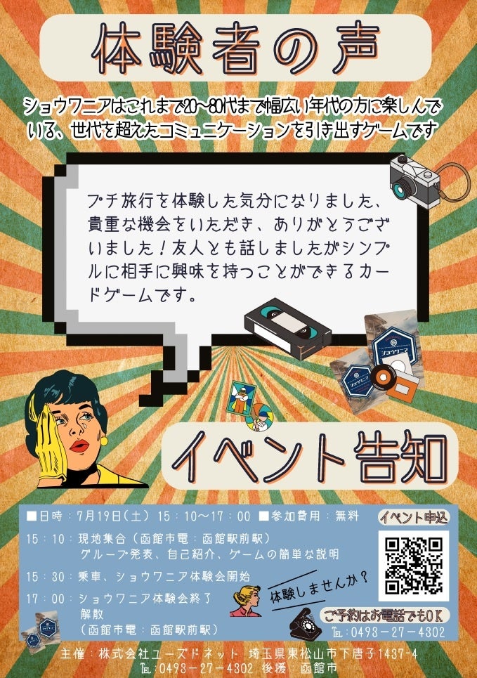 株式会社ユーズドネットが主催する、昭和のモノ、文化、出来事をテーマにしたオリジナルカードゲーム「ショウワニア」の体験会を、函館市電の貸切電車内で開催いたします。