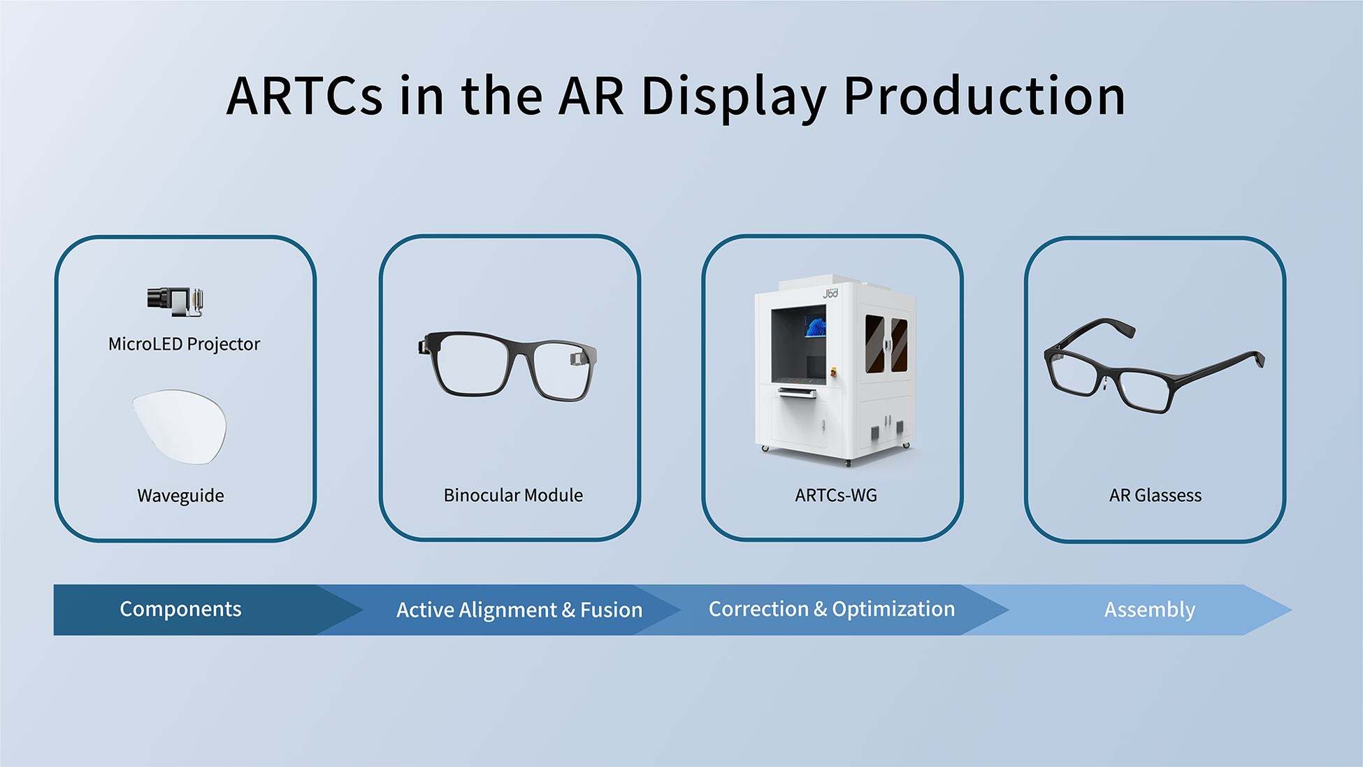 光導波路による仮想映像表示はかねてより輝度ムラや色再現の歪みといった欠陥を抱え、AR視覚体験を大きく損なってきた。この業界課題に応えるため、JBDは2024年、業界初となるAR光導波路画質補正ソリューション ARTCs と、それに対応する量産装置 ARTCs-WG を発表した。同システムは光エンジン側での処理と独自アルゴリズムにより、MicroLED光導波路ARグラスの全体輝度均一性を「<40 %」から「>80 %」へ引き上げ、色差ΔEを「>0.1」から「≈0.02」へ低減し、色歪みと粒状感を効果的に解消して光導波路表示品質を大幅に向上させた。