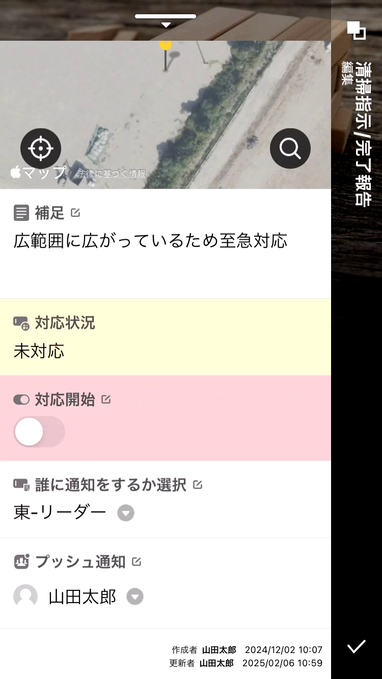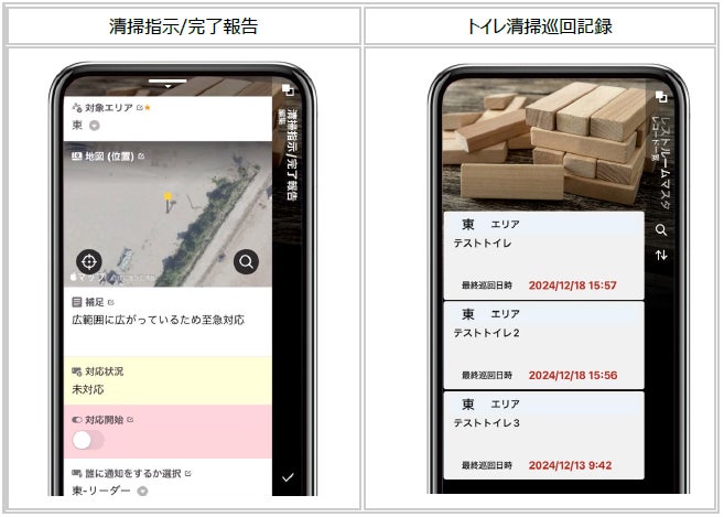 会場内における清掃管理 ・清掃の指示(位置情報・状況・緊急度)をプッシュ通知で共有 ・トイレごとに設置されたQRコードを読み取ることで簡単に記録 ・プルダウンの選択式やボタンのオンオフで清掃報告 ・不具合箇所を写真付きで報告 ・入力データによる報告書の自動作成 |