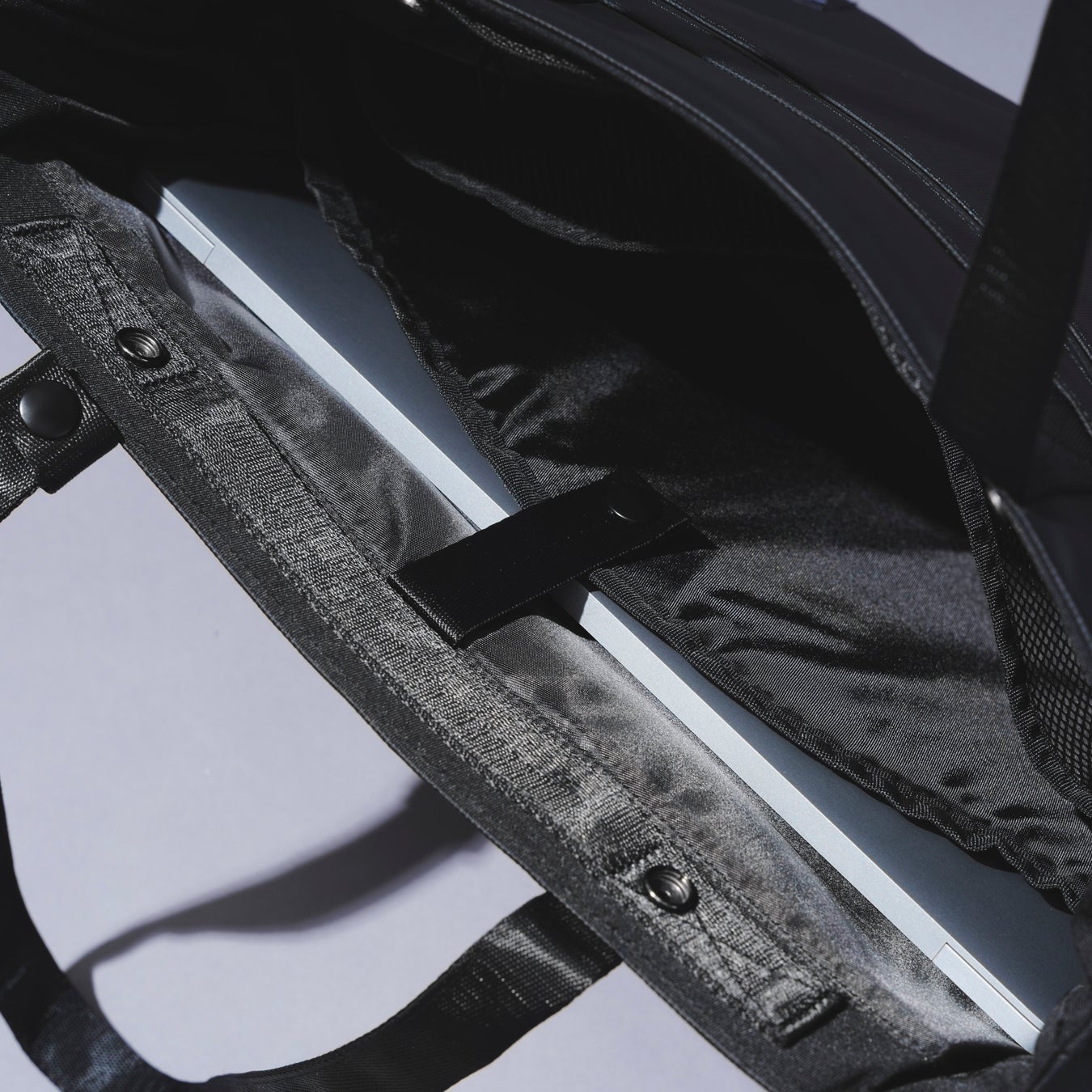 バッグ単体の重さは約670g。一般的に男性1kg前後、女性は800g前後までが快適に持てる重さと言われており、一般的なビジネスバッグの平均的な重さは1kg〜1.3kg程度。SAUNA LIFE BAGの軽量性は持ち運びのしやすさにも貢献している。また、ビジネストートバッグは数あれど16インチサイズのノートPCを持ち運べるタイプは意外と少ない。MAC BOOK PROに代表されるように、近年の高スペックで作業効率の高いノートPCは大型ディスプレーを採用する傾向にあるため、そのスペックのPCの収納を考慮した。