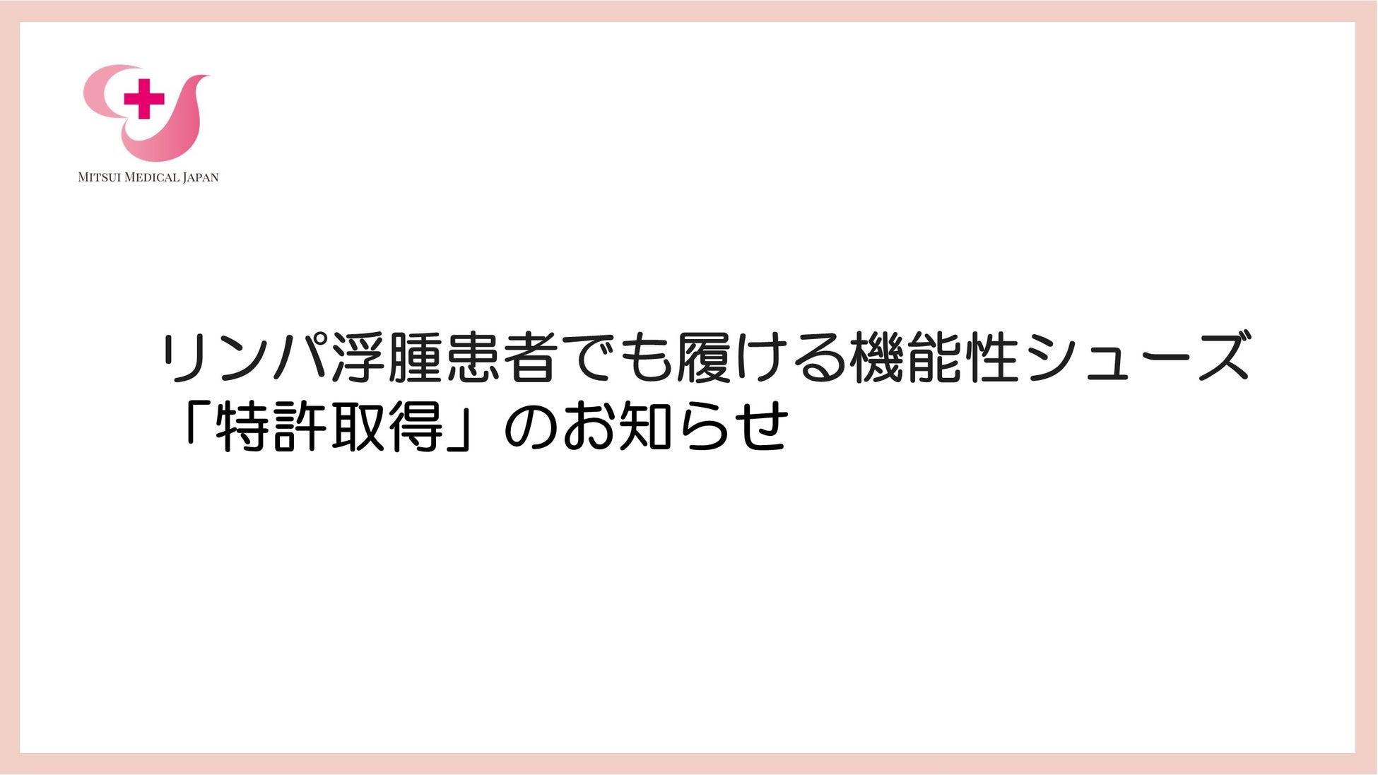 がんサバイバー、骨盤臓器脱患者など深刻な医療課題を抱える方たちの症状緩和、予防につながる医療機器の企画・開発・製造を手掛ける株式会社三井メディカルジャパン(本社:東京都中央区、代表取締役:三井桂子)はこの度、リンパ浮腫患者でも履けるシューズを開発し、2025年1月15日に特許を取得したことをお知らせいたします。