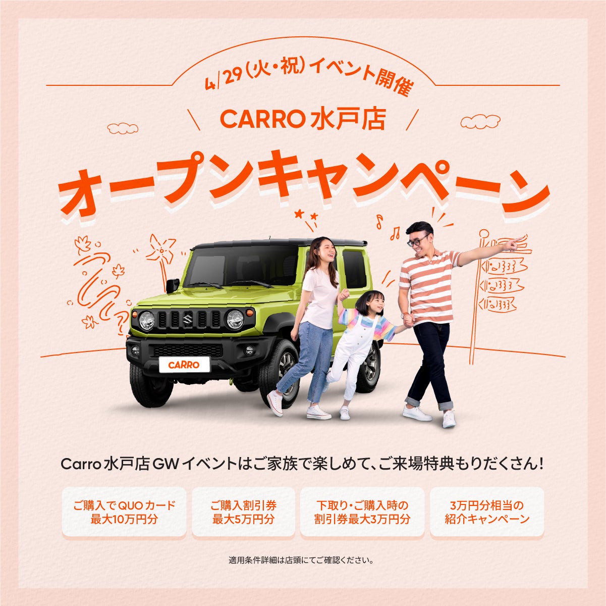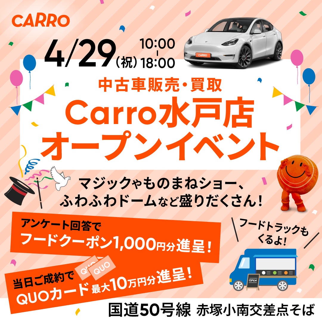 "新品のような状態”の中古車を目指す、あんしんと信頼の中古車マーケットプレイス「Carro(カーロ) 」が、水戸にオープン!2025年4月29日(火・祝)にご家族で楽しめる記念イベント開催