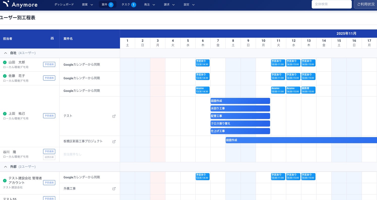 本機能では、「Anymore施工管理」で登録した予定に加え、Googleカレンダー連携により取得した各ユーザーの予定を同一画面上で確認することができます。これにより、案件に関わるすべての関係者のスケジュールを一元的に把握し、最適なタイミングでの作業依頼が可能となります。