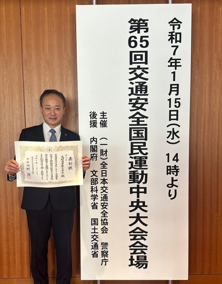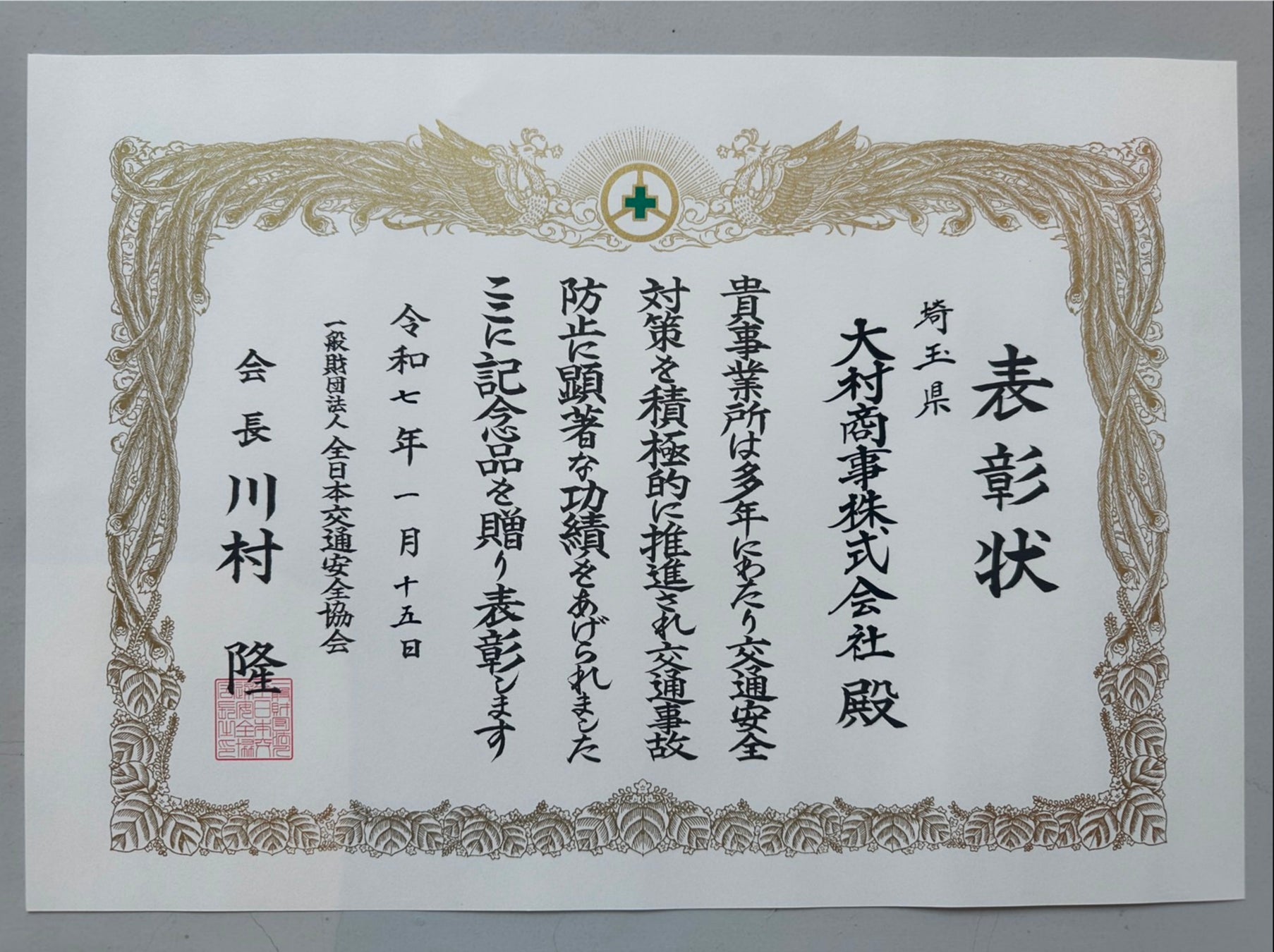 大村商事株式会社(本社:埼玉県志木市、代表取締役:大村相哲、以下「当社」)は、令和7年1月15日に東京都文京区の文京シビックホールで開催された「第65回 交通安全国民運動中央大会」にて、「交通安全優良事業所」として表彰されたことをお知らせいたします。