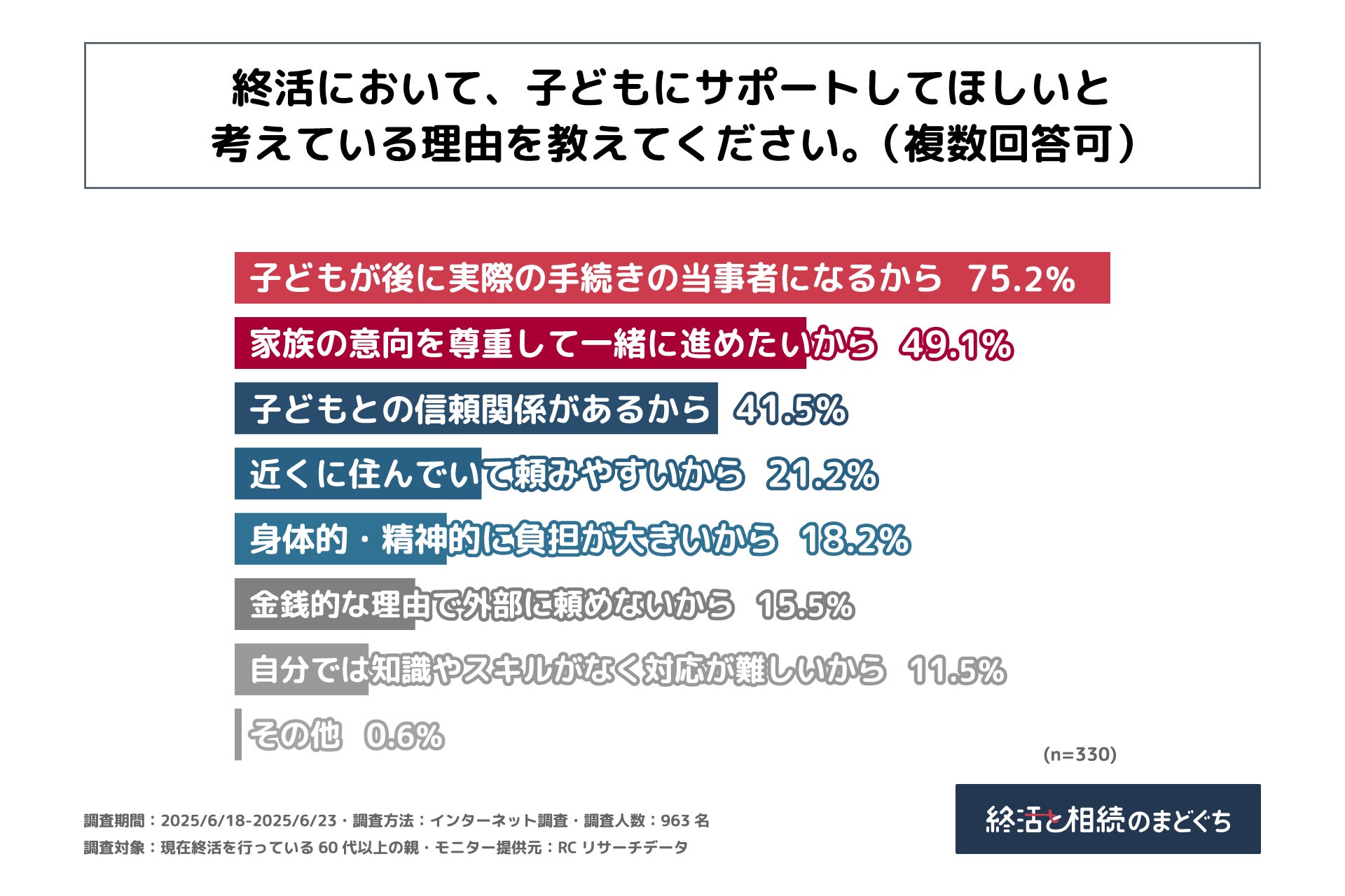 また、子どもに終活をサポートしてほしいと思うと回答した人を対象に「終活において、子どもにサポートしてほしいと考えている理由」を尋ねる設問への回答では、1位が「子どもが後に実際の手続き当事者になるから」で75.2%、2位が「家族の意向を尊重して一緒に進めたいから」で49.1%、3位が「子どもとの信頼関係があるから」で41.5%という結果になりました。この結果から、終活において、子どもにサポートしてほしいと考えている理由で最も多いのは、「子どもが後に実際の手続きの当事者になるから」であることが明らかになりました。