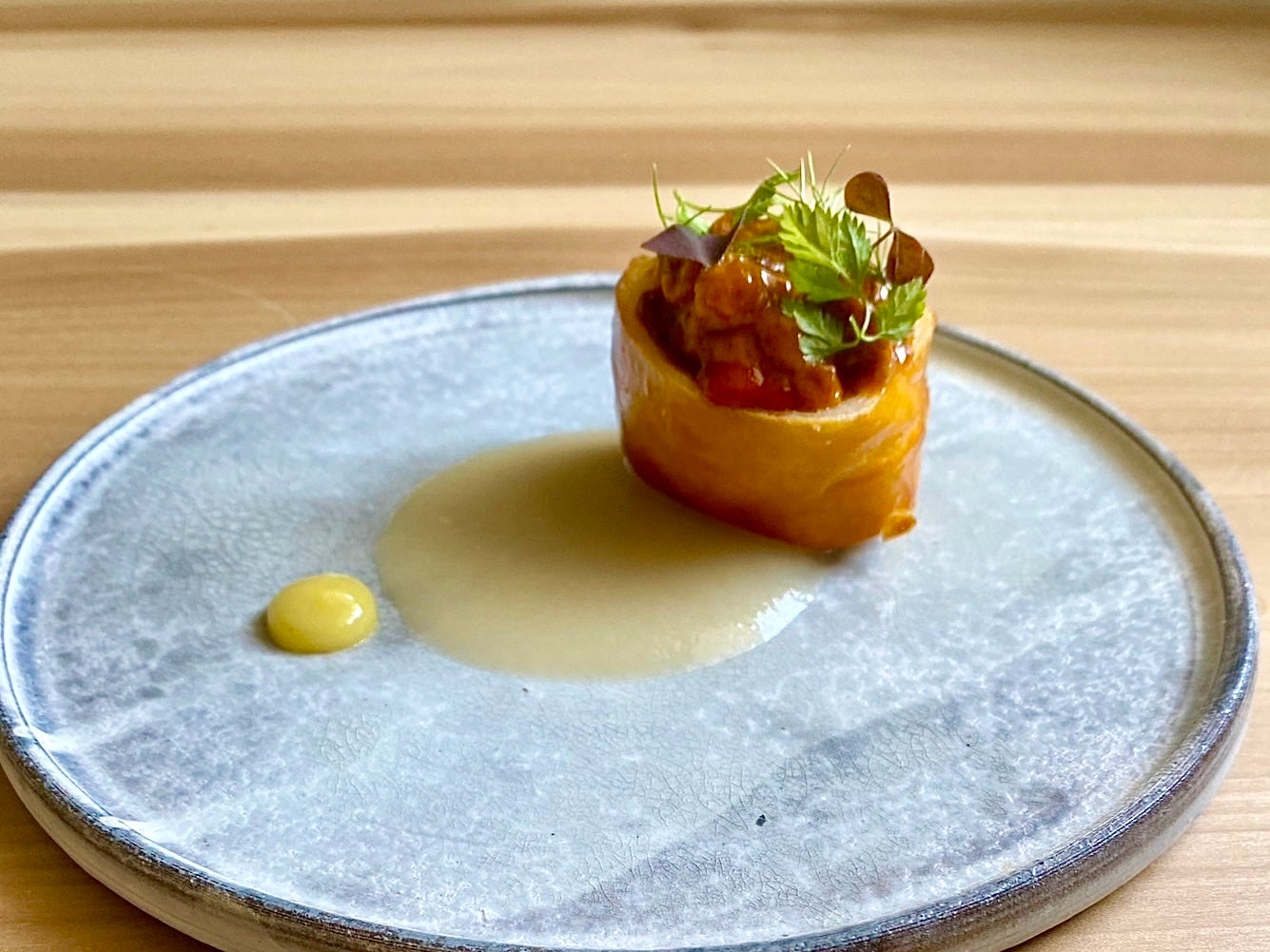 壱岐のイカをパイ包み焼きに、その上に濃厚な雲丹を乗せ、優しいカブのソースと柚子のアクセント、熱々なパイ包みと立ち香る生ウニを お楽しみください。