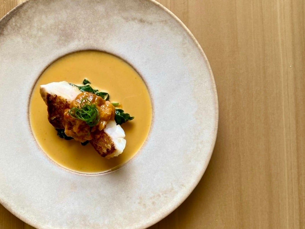 キジハタをパリッと香ばしく焼き上げ、濃厚な旨味を持つ雲丹のクリームソースを添え、仕上げに採れたての生雲丹を乗せた贅沢に乗せた一皿です。