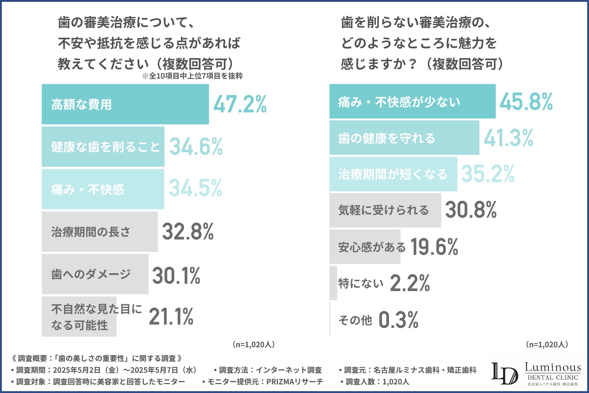 保険が適用されないことから『高額な費用』や、『健康な歯を削ること』への抵抗感、治療時や治療後の『痛み・不快感』といったさまざまな懸念が浮き彫りになりました。