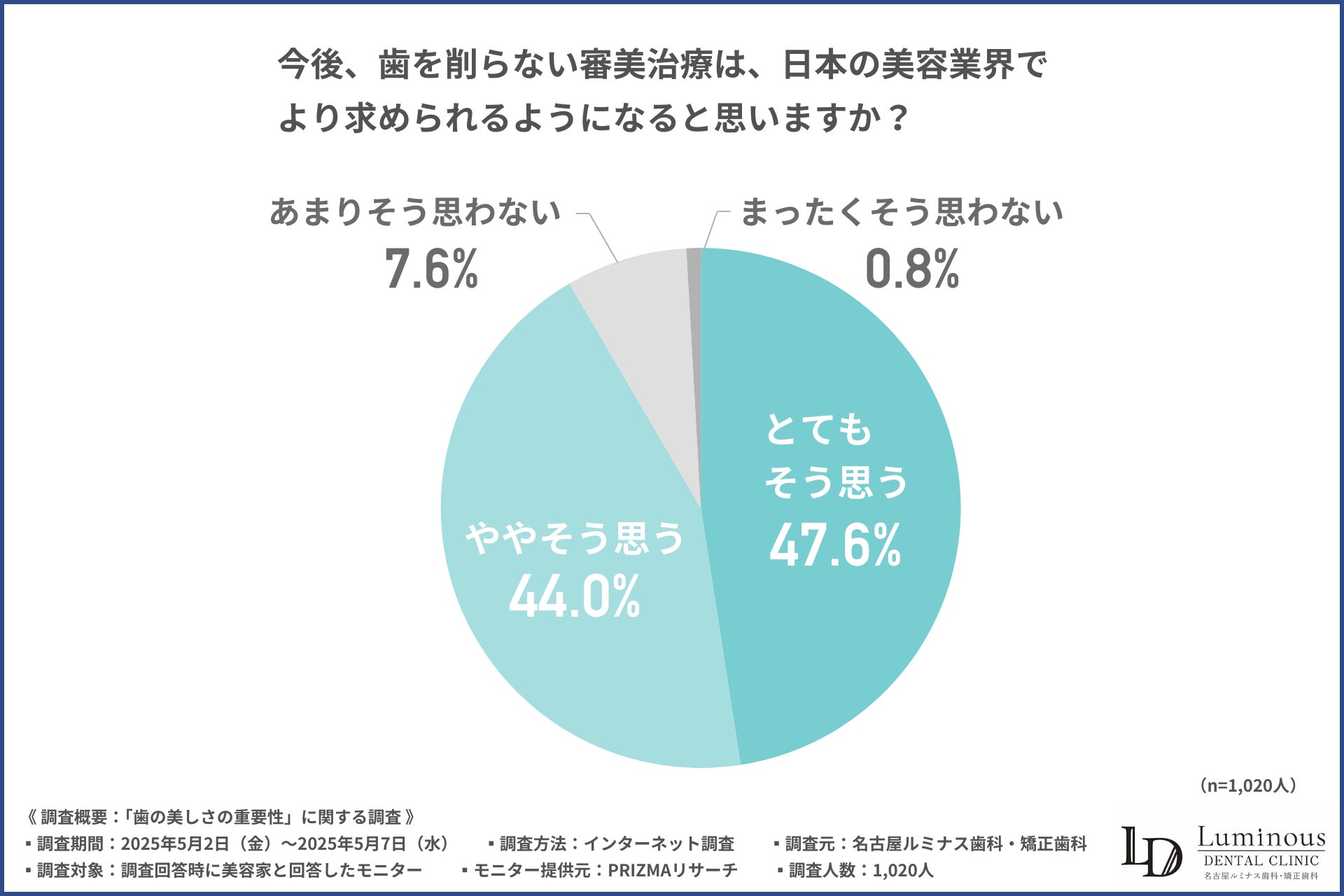 最後に、「歯を削らない審美治療は、今後の美容業界で需要が高まると思うか」と尋ねたところ、9割以上が『とてもそう思う(47.6%)』『ややそう思う(44.0%)』と回答しました。