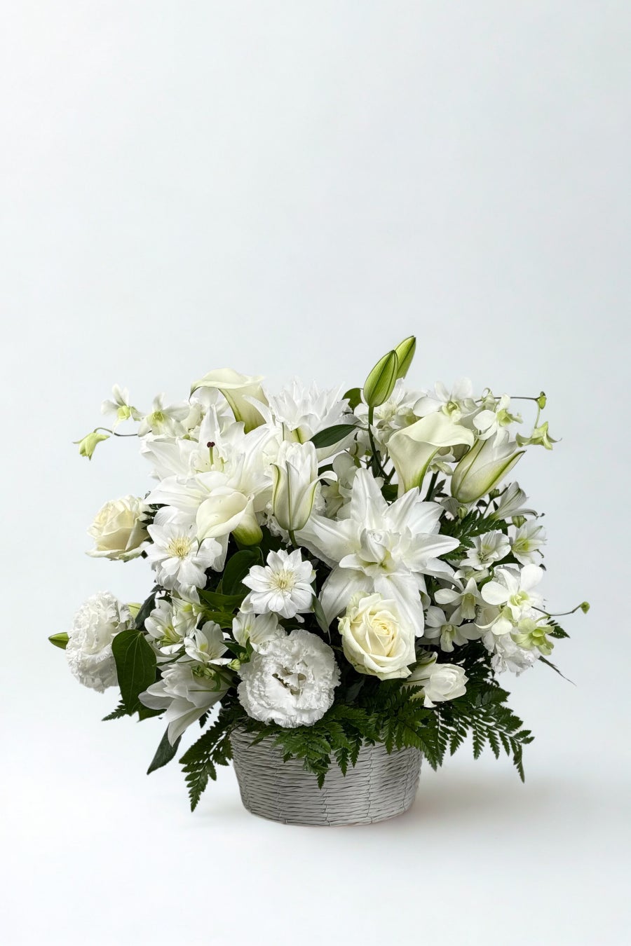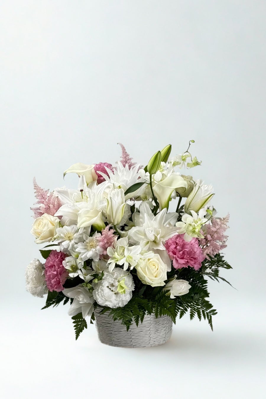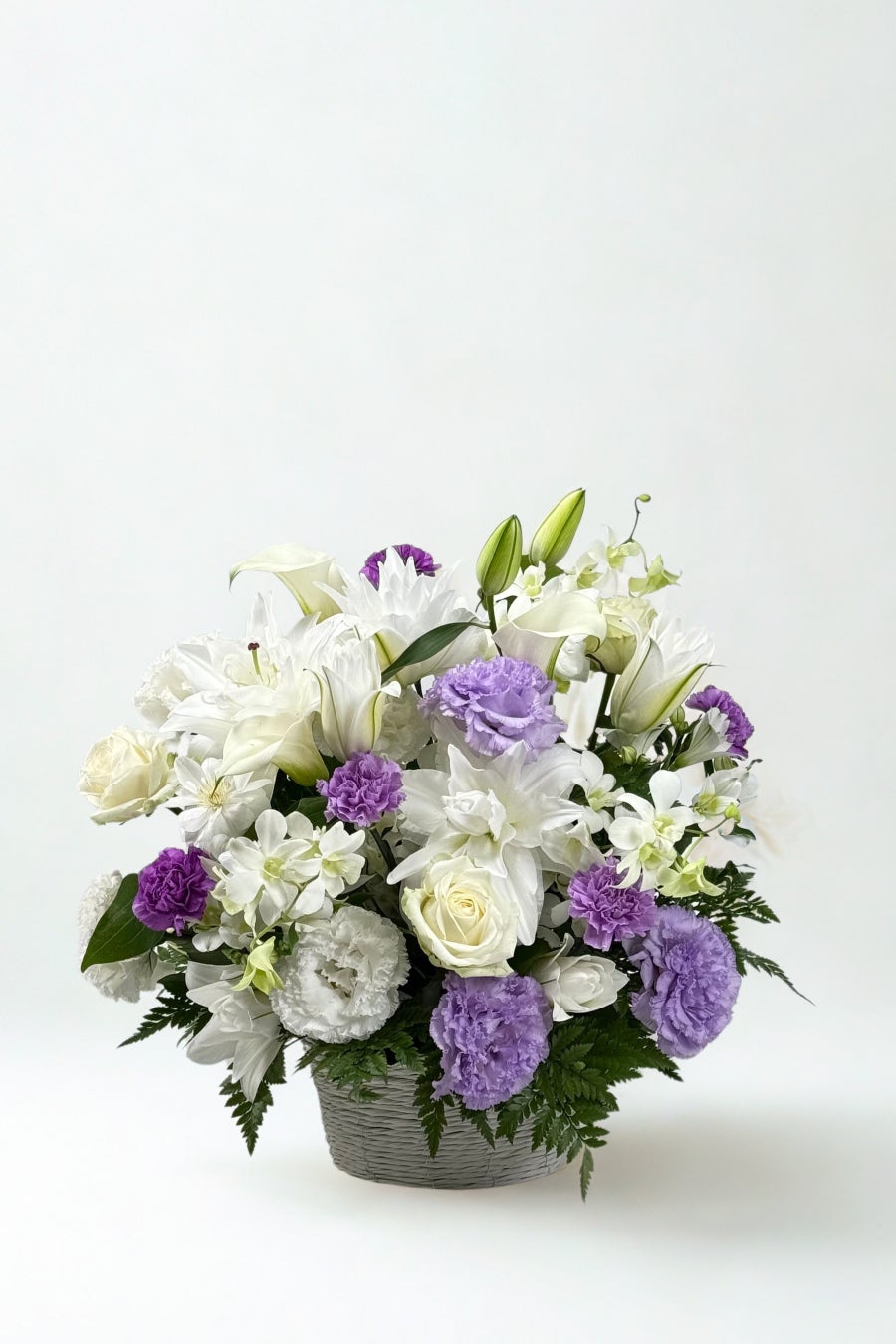 深い祈りと感謝を花に託したラージサイズのアレンジメント。静かで格調高い色合いの花々が、凛とした美しさとあたたかみを同時に演出します。ご法要や命日など、大切な節目にふさわしい逸品です。